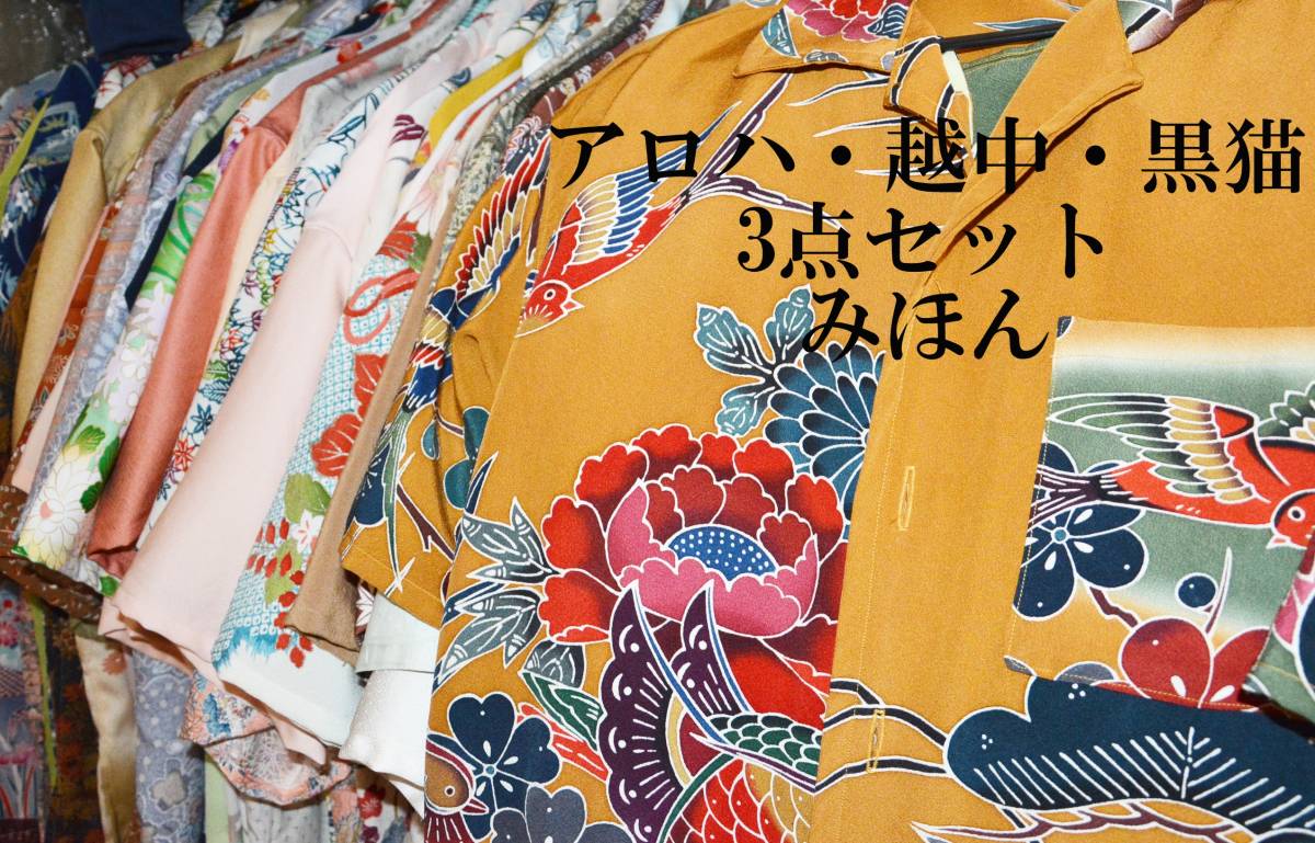 出品は、アロハシャツ・越中褌・黒猫褌各1枚の、3点セット。