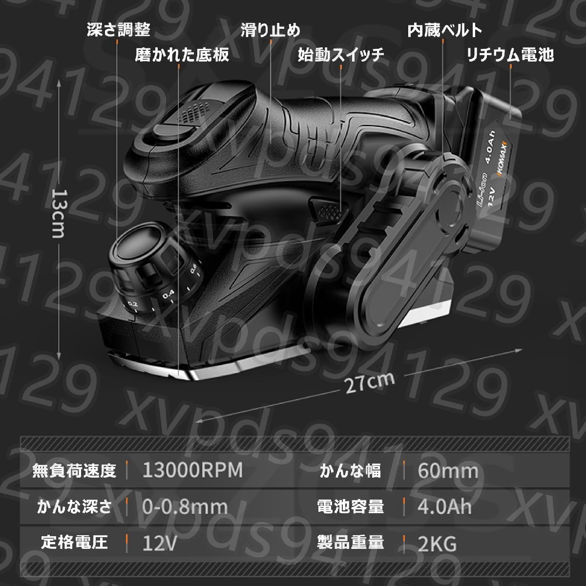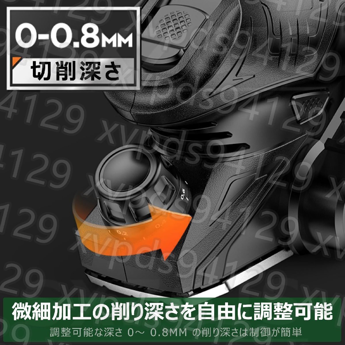 【充電式電気カンナ 】:刃幅幅60mmで最大切削深さ 0.8mm。切込深さ調節。無負荷速度: 13000R/MIN。 商品のサイズ(27*13cm)小さくて軽く、持ち運びが簡単で、長期間使用しても疲れません。