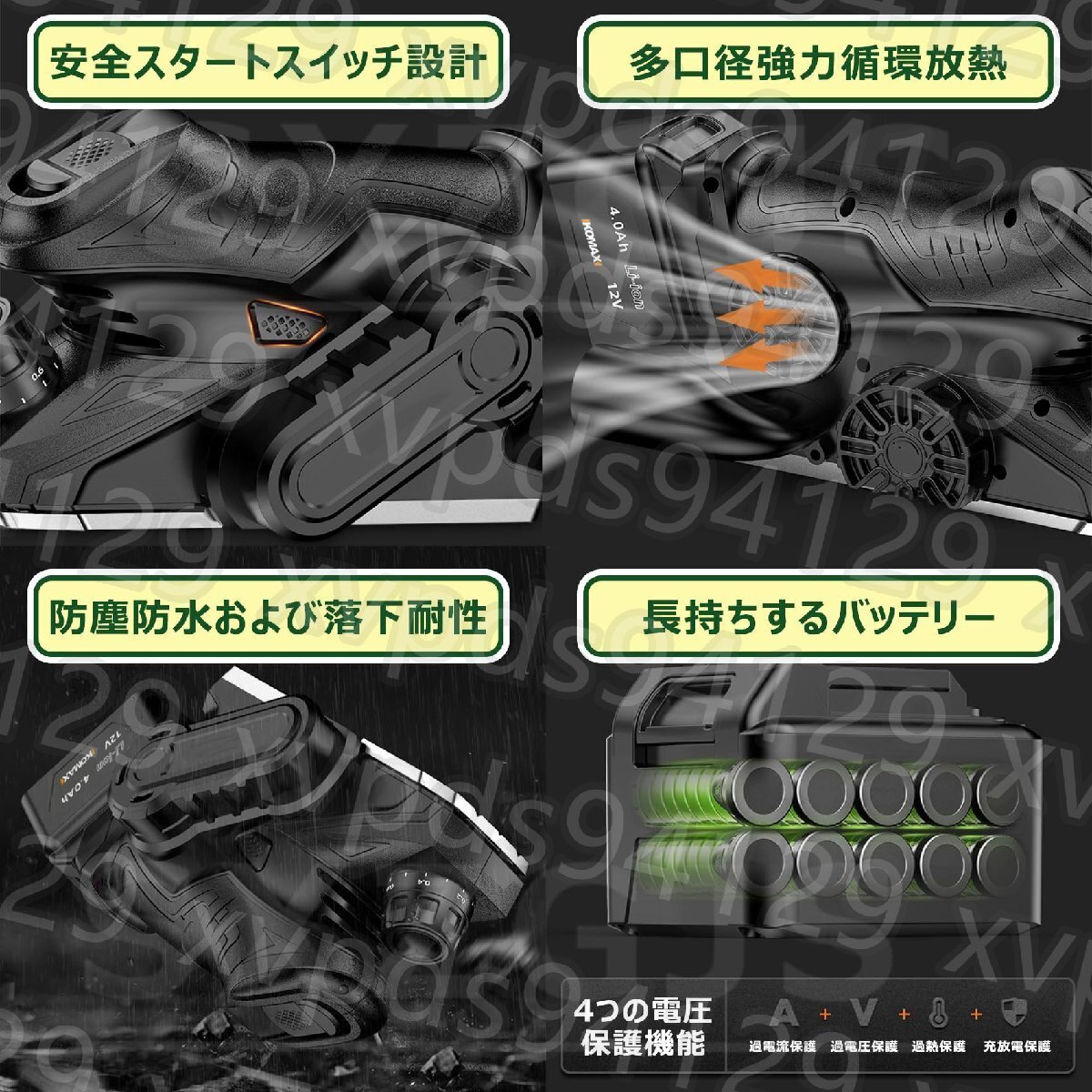 【長い作業時間&優れた性能】コードレスカンナには大容量のリチウム電池が搭載されており、より長く動作するため、頻繁に充電する必要はありません。多口径の三次元吸気口は強力な放熱システムを提供し、低発熱の銅コアモーターと組み合わせて、熱を軽減するだけでなく、プレーナーのパフォーマンスを向上させ、長時間の稼働を可能にします。