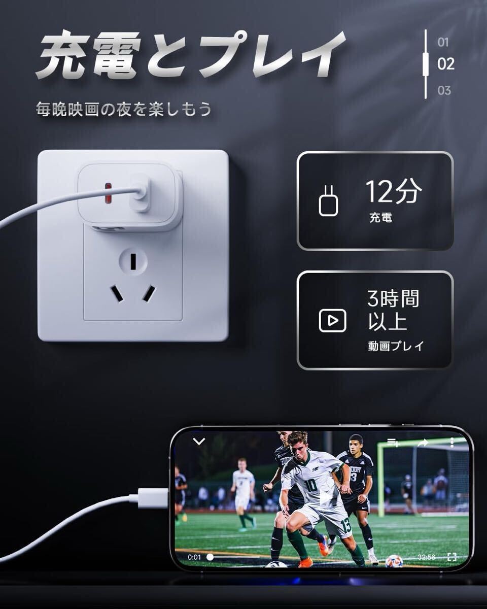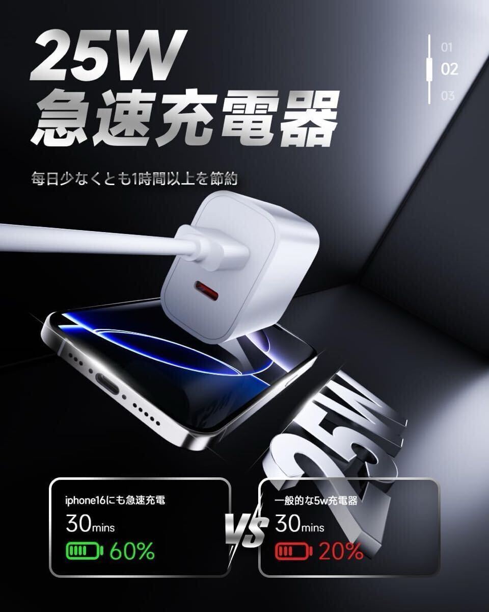 急速充電の対応機器を効率的に充電できます。type-c急速充電器で、25Wの急速充電が可能です。iPhone16は約60分で充電が完了し、通常の充電器の4倍の速さで充電できます。約2時間のフル充電後、MacBook Proは約1.5時間の充電が可能です。従来のtype-c充電器と比べ、約6倍の高速化を実現しています。わずか30分でiPhone16を0 ~ 60%充電できます。充電時間が40分以上短縮され、1日1時間以上の節約につながります。いつでもバッテリーがフル充電になり、充実した電力を実現します。