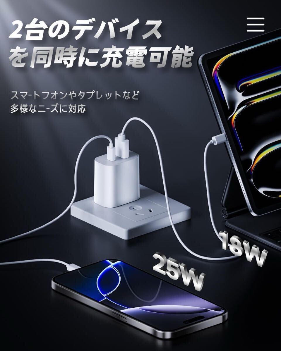 USB PD&Quick Chargeはデュアルポート充電に対応しています。充電器の最大出力を各ポートに均等に割り当てることができます。自働的に機器の接続を検知し、適切な電力レベルに調整します。同じ充電器や充電ケーブルを使っていても、接続する機器によって出力が変わります。(例えば、最大25Wまで使用する本製品の充電器は、タブレットとスマートフォンを同時に充電する場合、最大25W x1(タブレット)と18W x1(スマートフォン)を使い分けられます。詳細は取扱説明書をご参照くださいませ。
