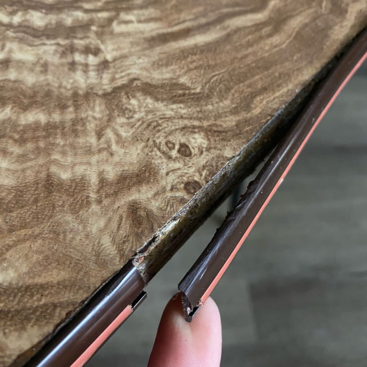 時代を感じるマーブル模様の天板にラインの入ったリム