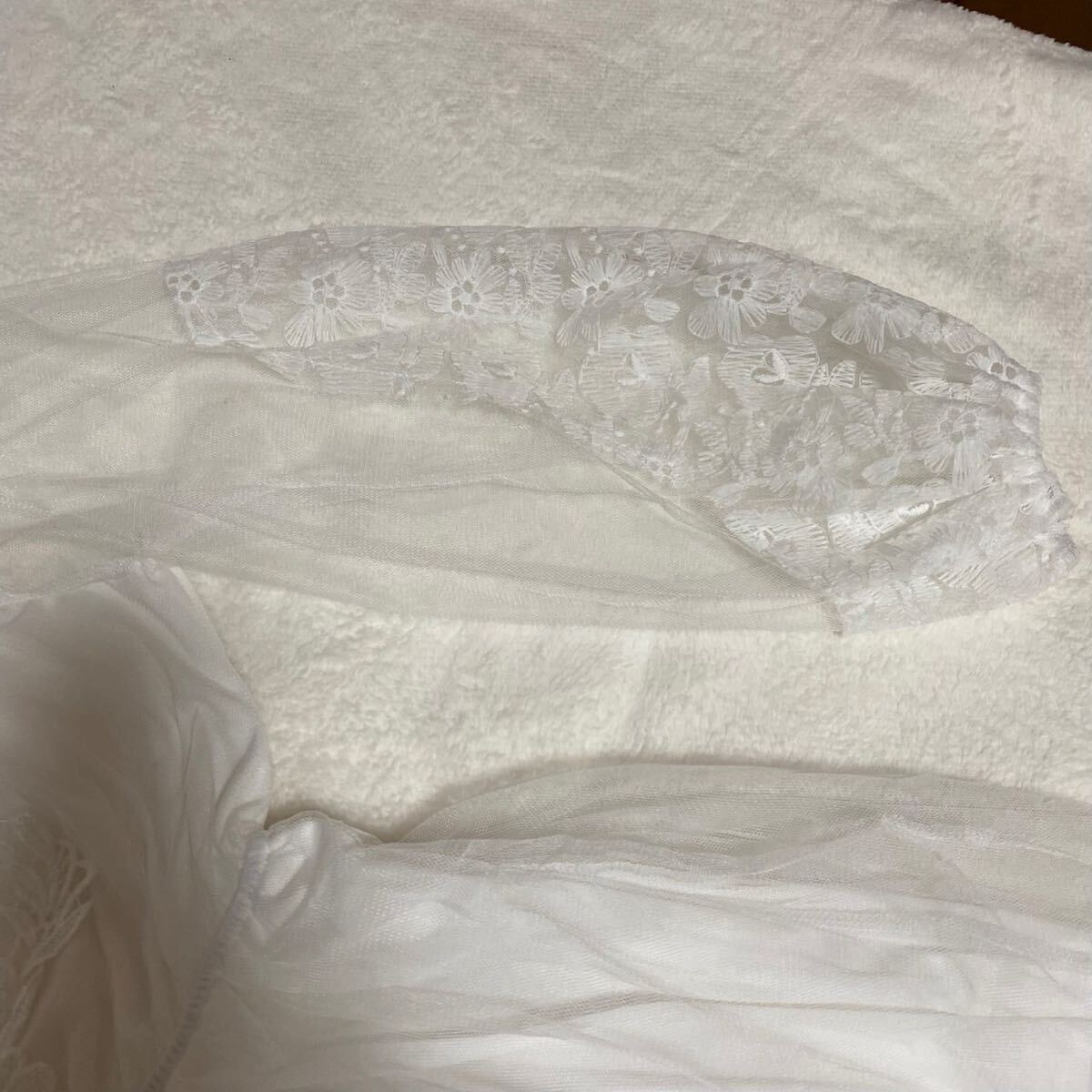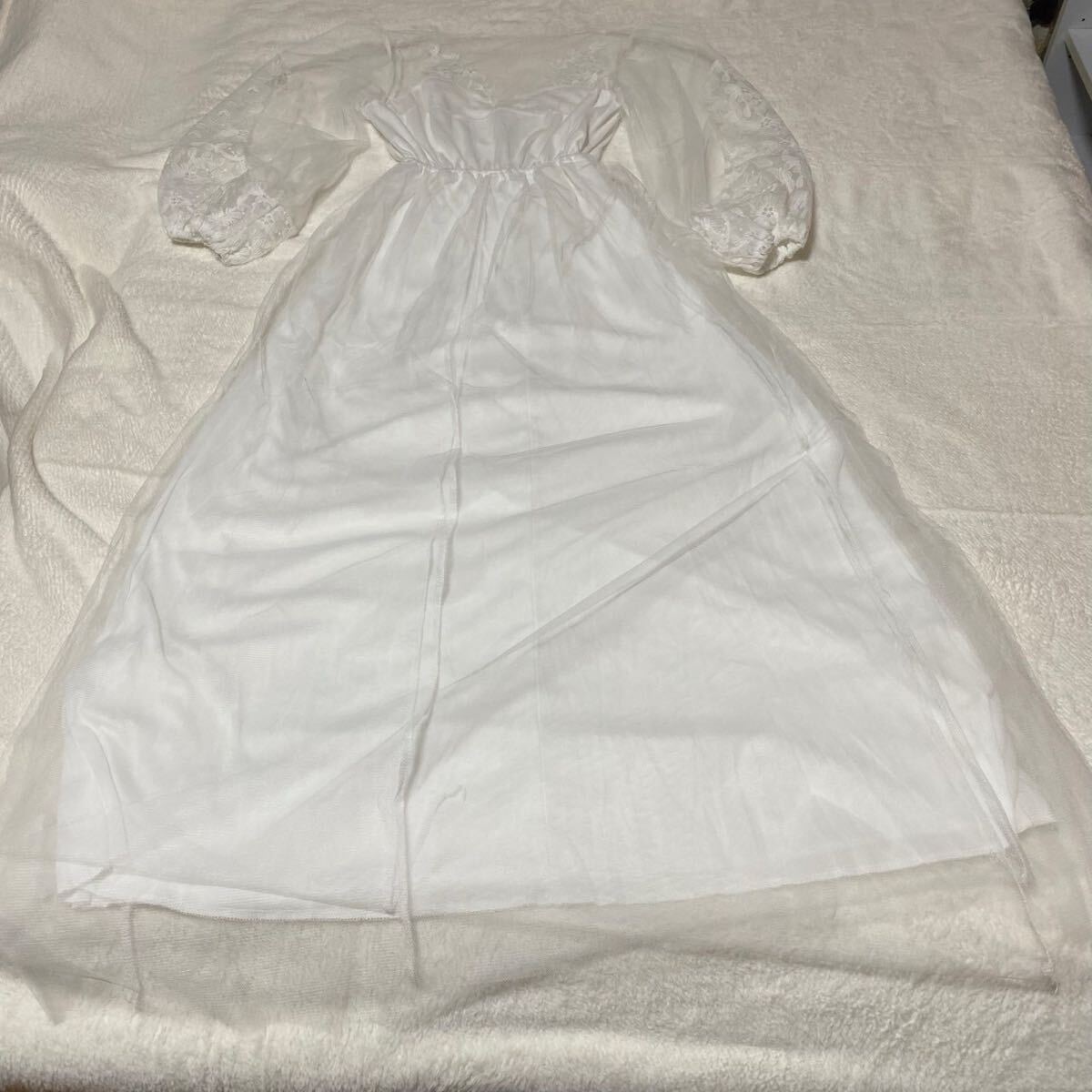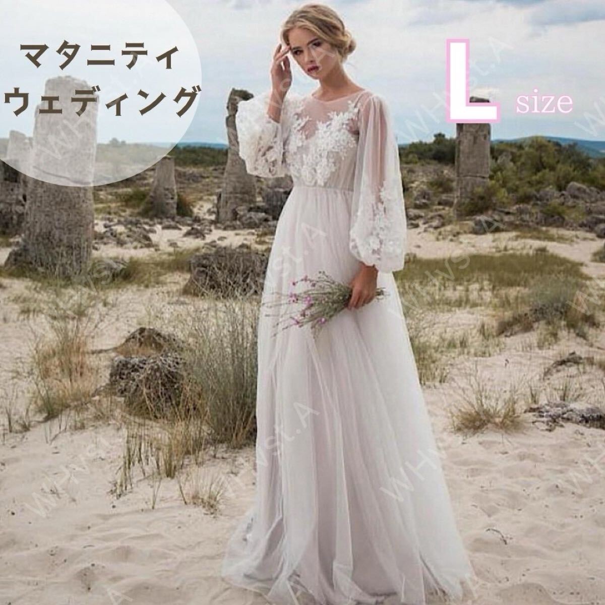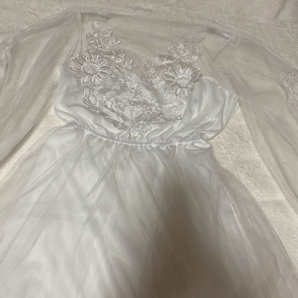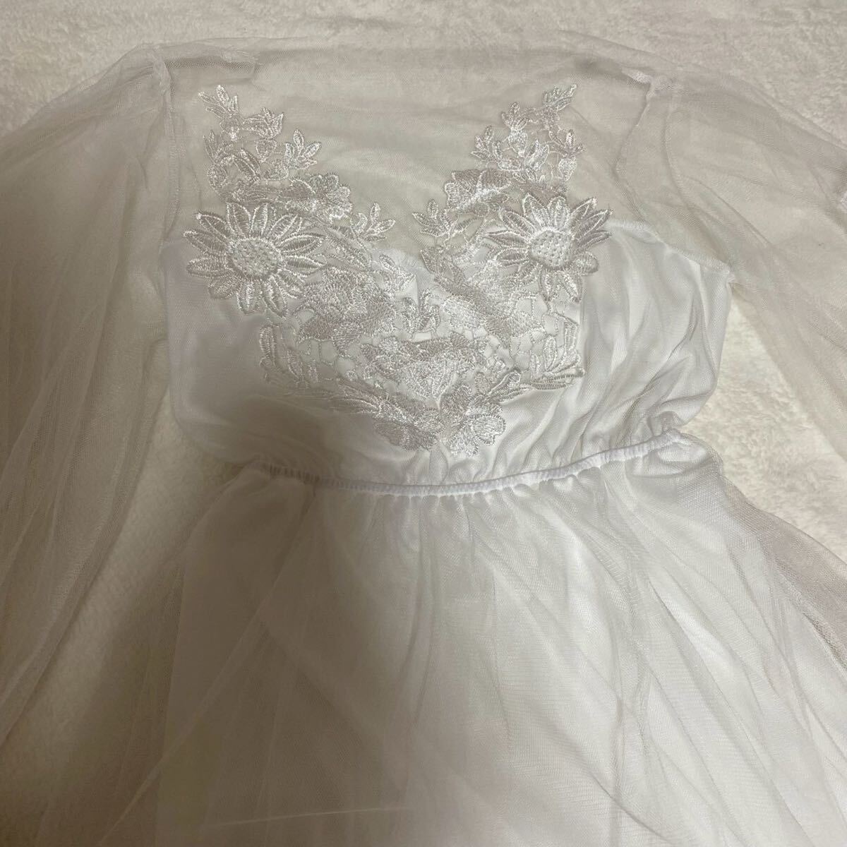 胸元や腕に繊細な刺繍が施されたエレガントなデザイン。透明感があり肌を見せすぎない上品な雰囲気が特徴です。エンパイアラインとボリュームスリーブが体型を美しくカバーし、二重チュールスカートで動きに華やかさをプラス。ウエストはゴム仕様で締め付けず、マタニティにも快適。