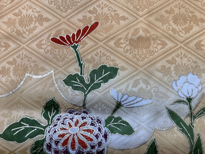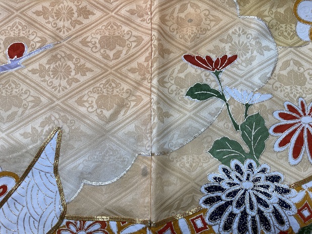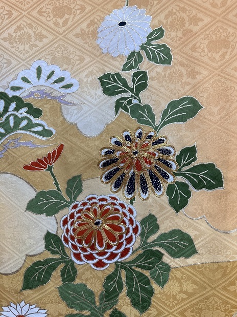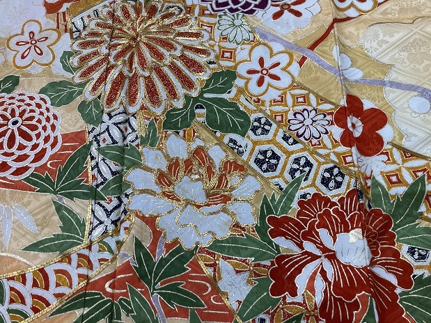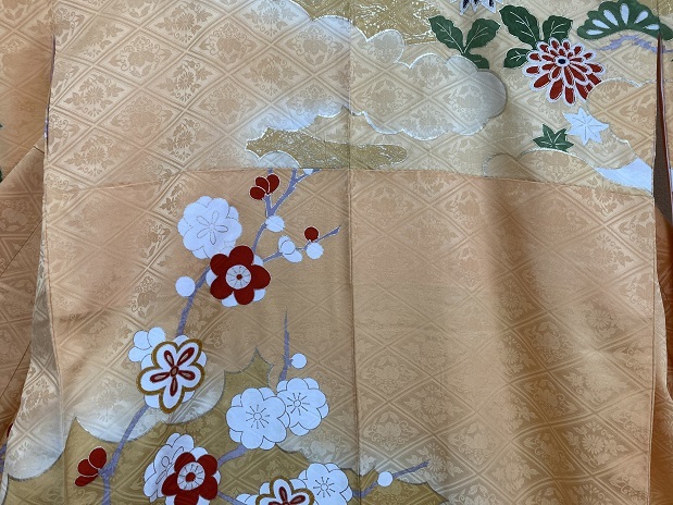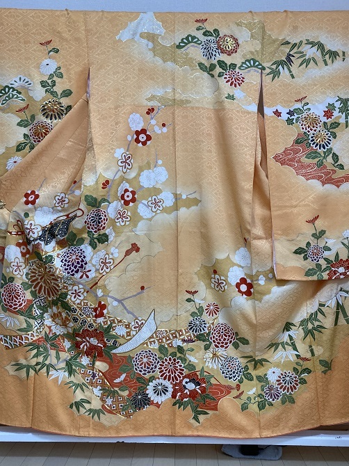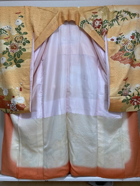 46.昭和レトロ◆正絹・中古◆鮮やかな金糸菊花牡丹、梅竹笹 振袖着物 十三参り 古布リメイク・◆身丈150センチ裄63センチ袖93センチ