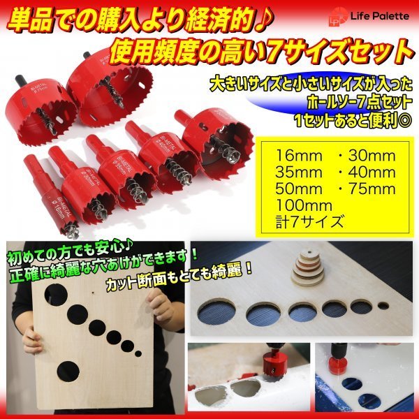 送料無料 徳用 7点 バイメタル ホールソー ホルソー セット 穴あけ 切削 工具 大型 16mm 30mm 35mm 40mm 50mm 75mm 100mm ライフパレット | |||