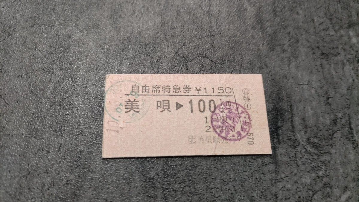 美唄駅発行「美唄→100kmまで」硬券の自由席特急券です。