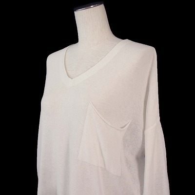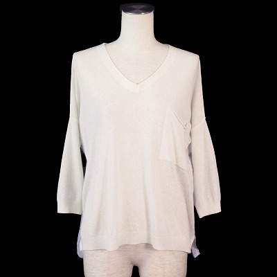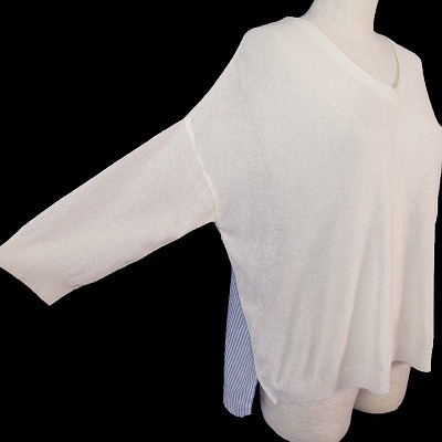 ノーリーズ Nolley's ニット カットソー Vネック ドッキング 異素材 切替 ストライプ コットンリネン 38 白 ホワイト レディース