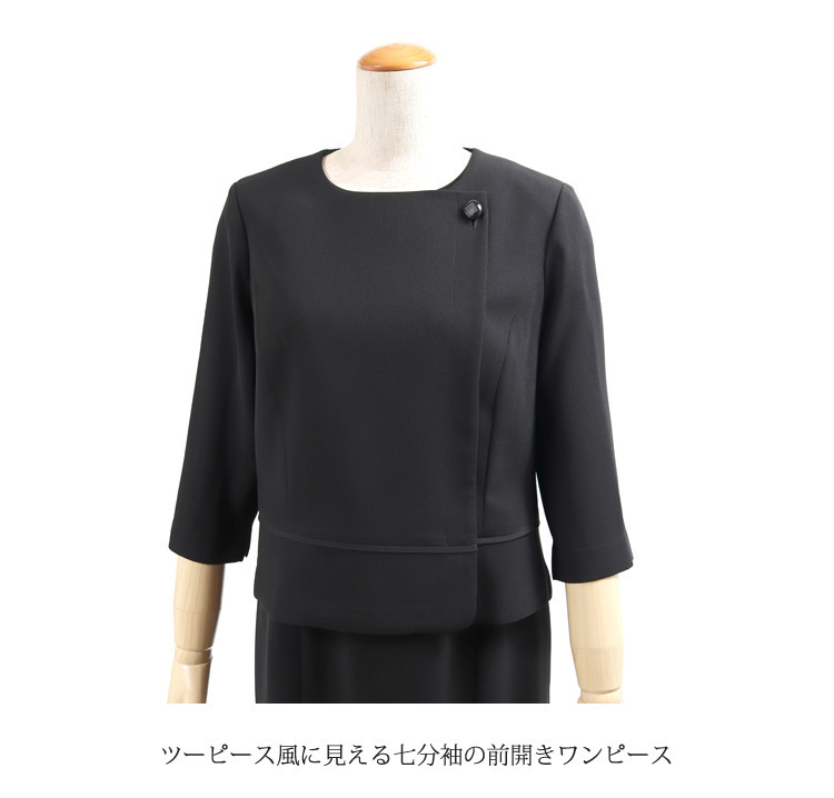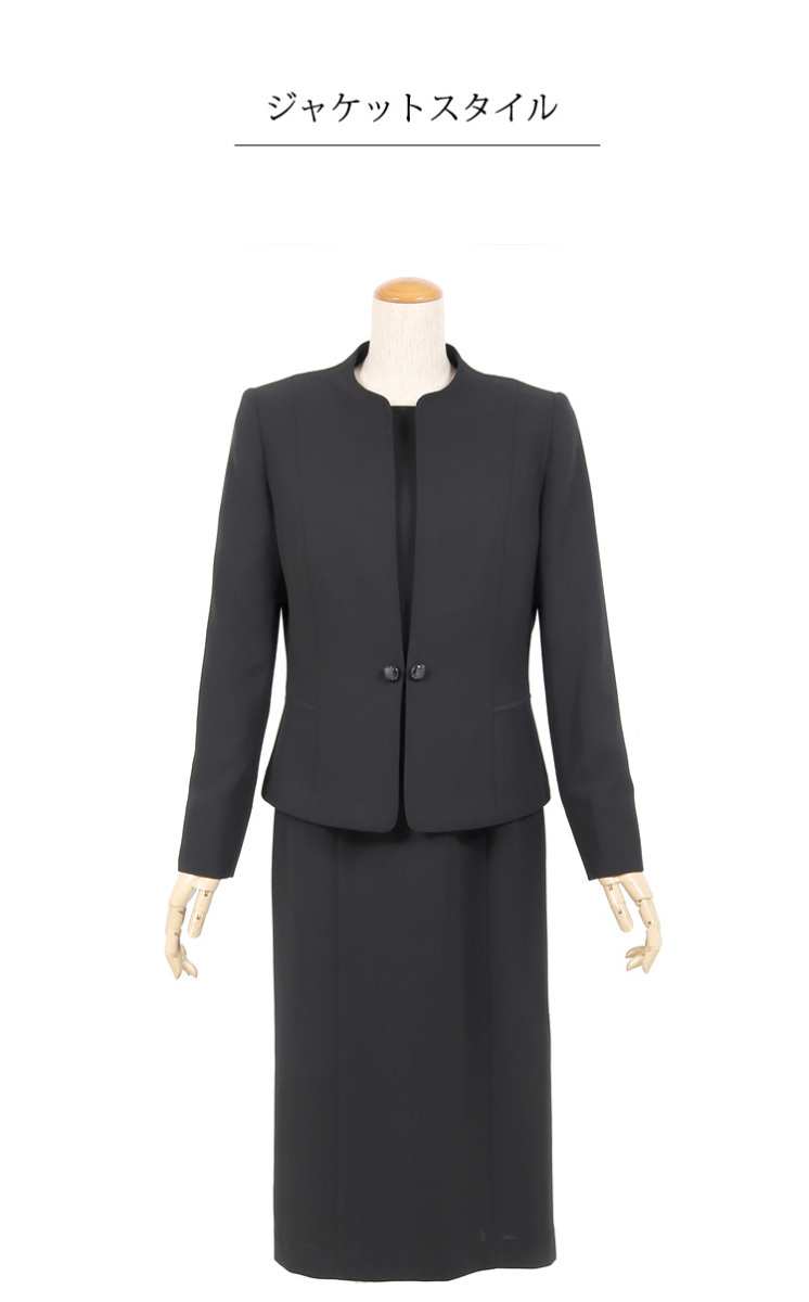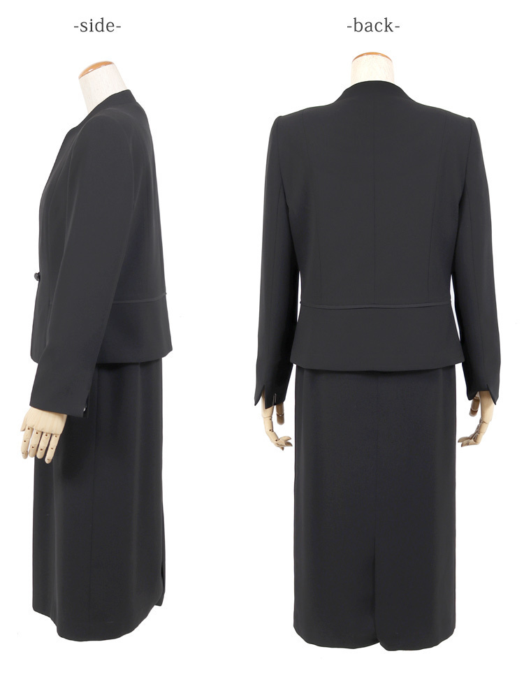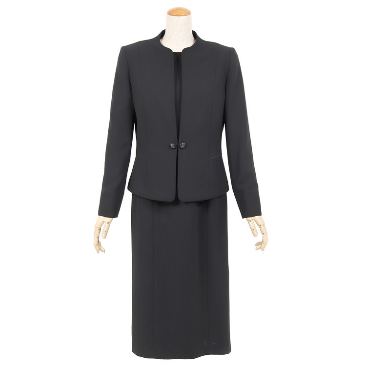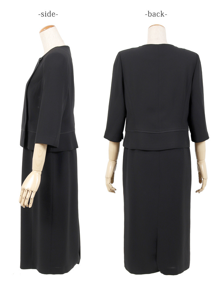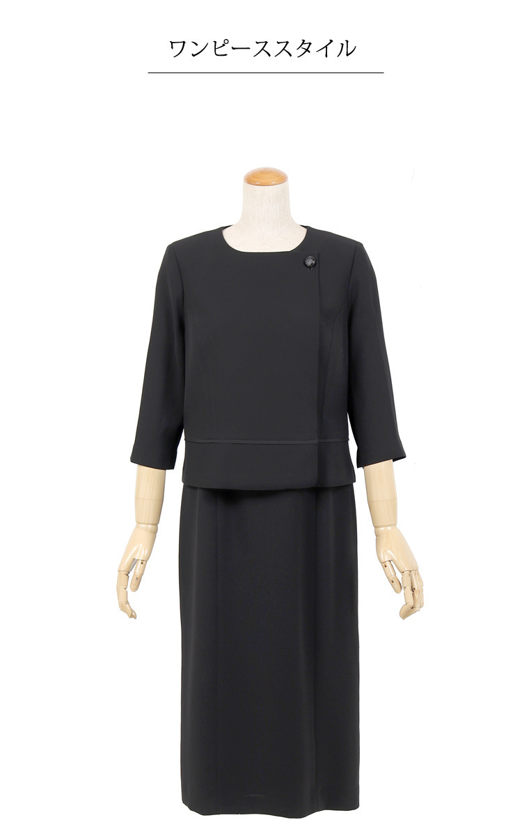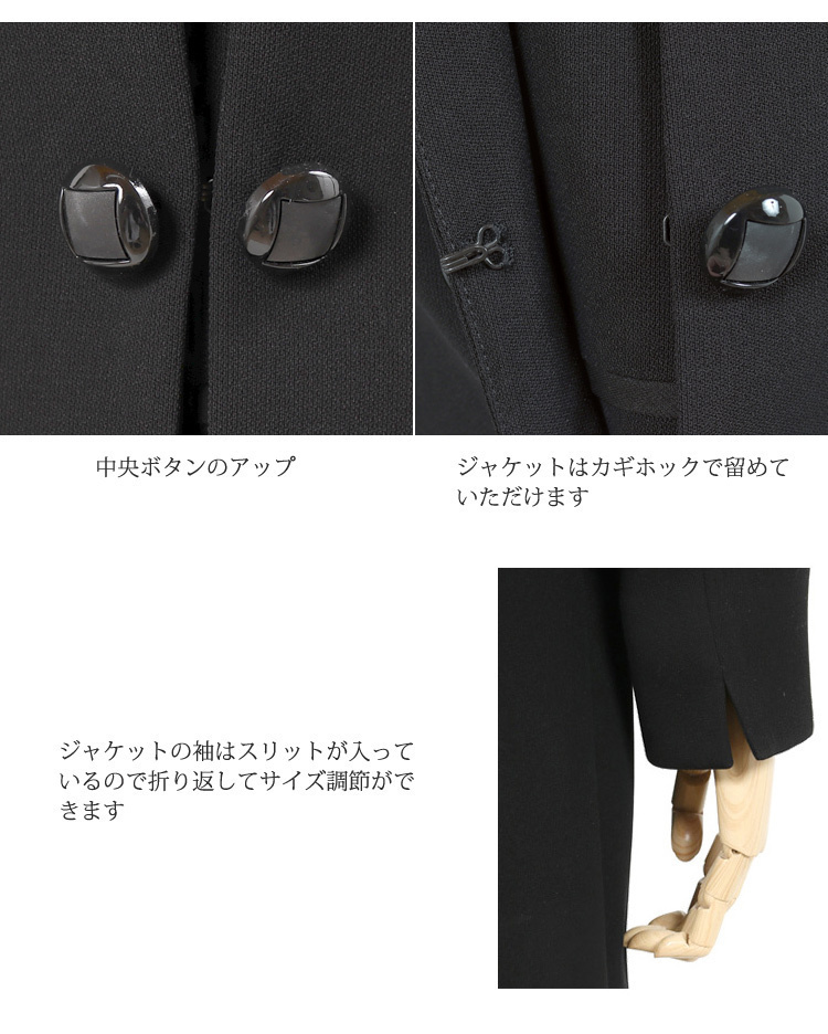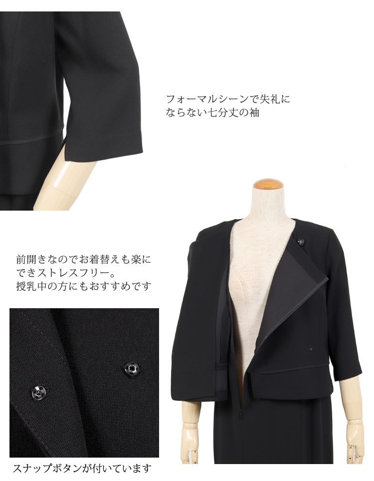 | 洗える ブラックフォーマル 15号サイズ 脱ぎ着が簡単で授乳中のママに人気の前開きブラックフォーマルです。 デザインもスッキリとしたノーカラーで高級感があります。 喪服としてだけでなく、お手持ちのコサージュをつけて、お子様の卒園式や卒業式などのママスタイルとしてもおすすめです。 こちらの商品はご自宅で洗濯が可能です。 ■商品番号 115t111-au ■セット内容 ジャケット・ワンピース ■実寸サイズ ジャケット