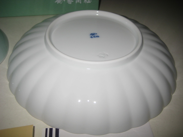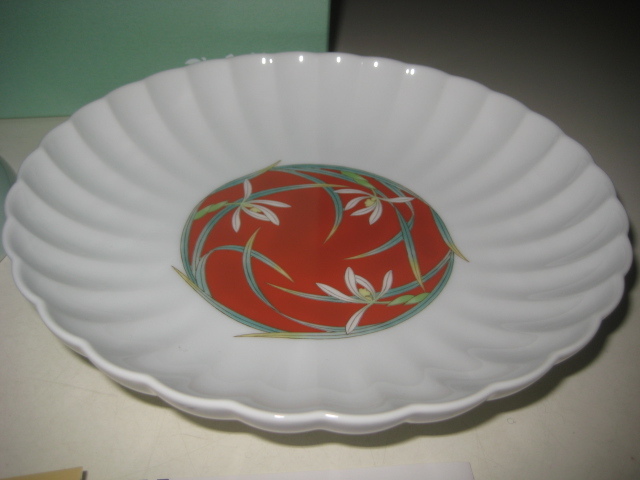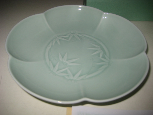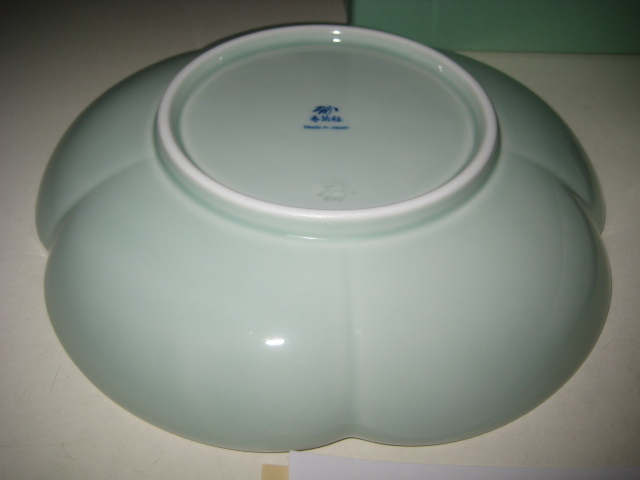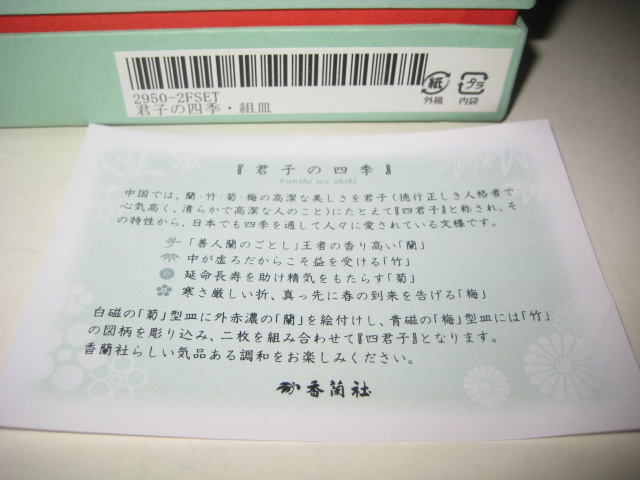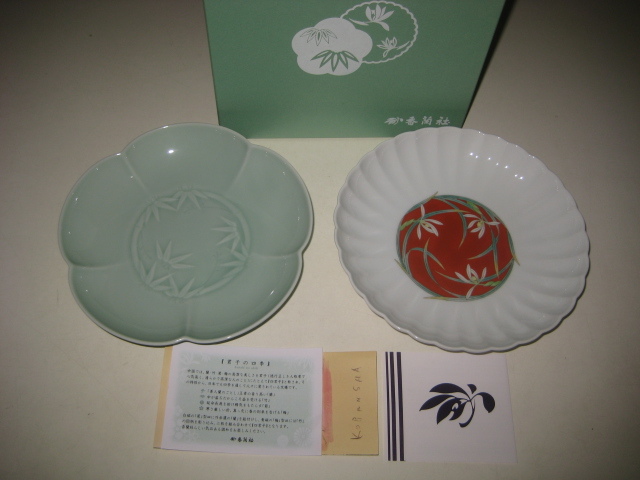 香蘭社 君子の四季 組皿 箱付 2950-2FSET (蘭・竹・菊・梅) 白磁外赤膿 青磁 梅型皿 菊割皿