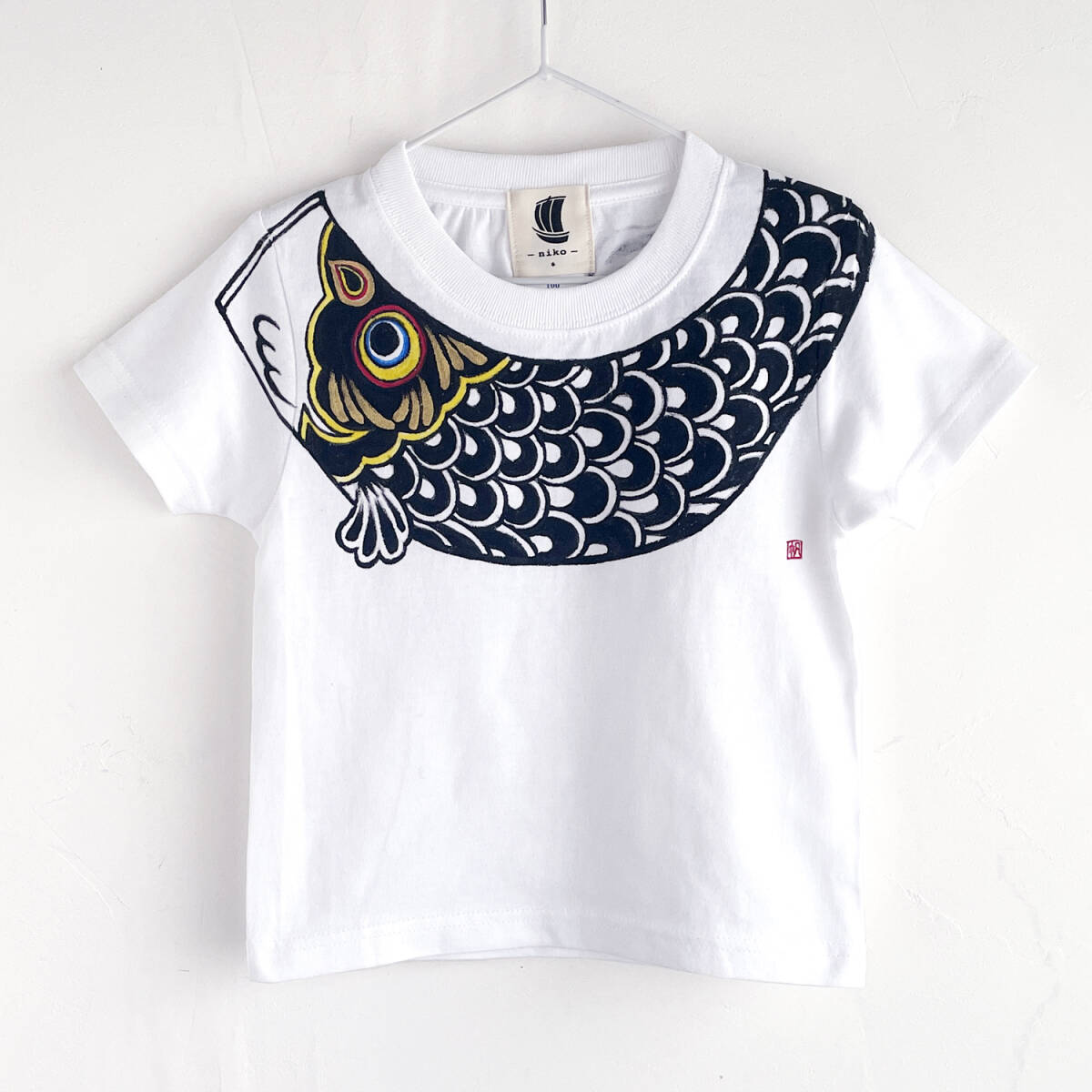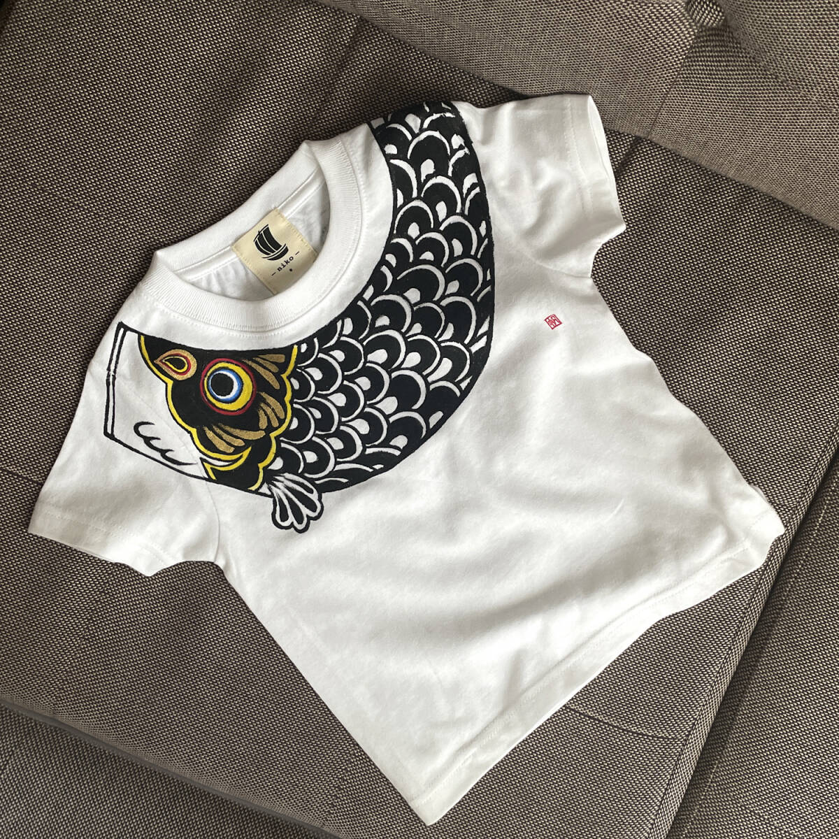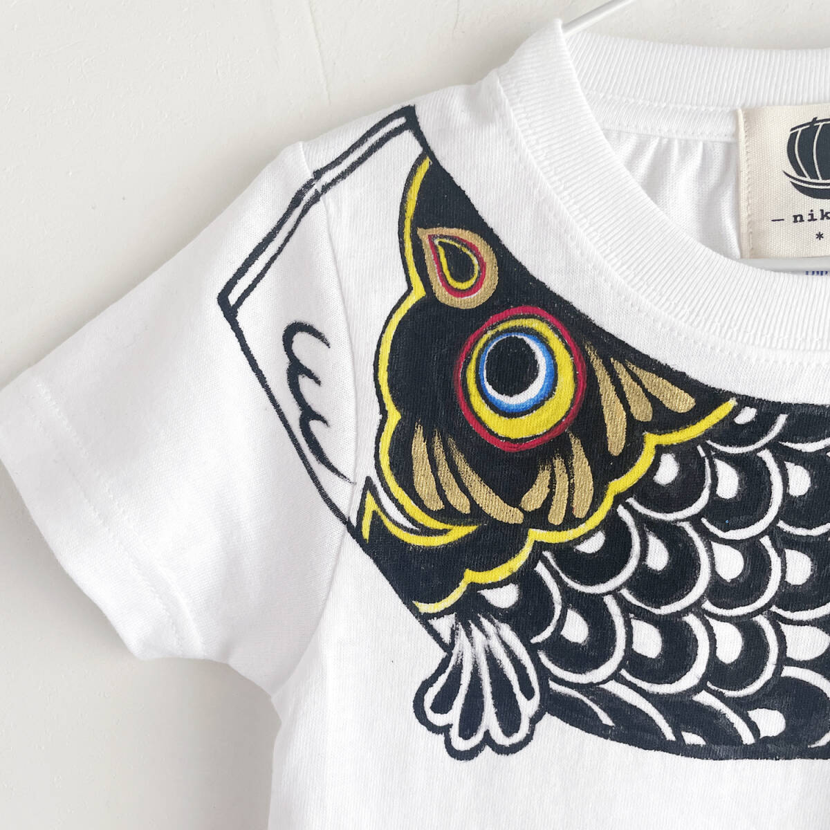 ハンドメイド 手描きTシャツ キッズTシャツ 鯉のぼり柄Tシャツ 手描きで描いた、こいのぼりのTシャツ ホワイト | |||