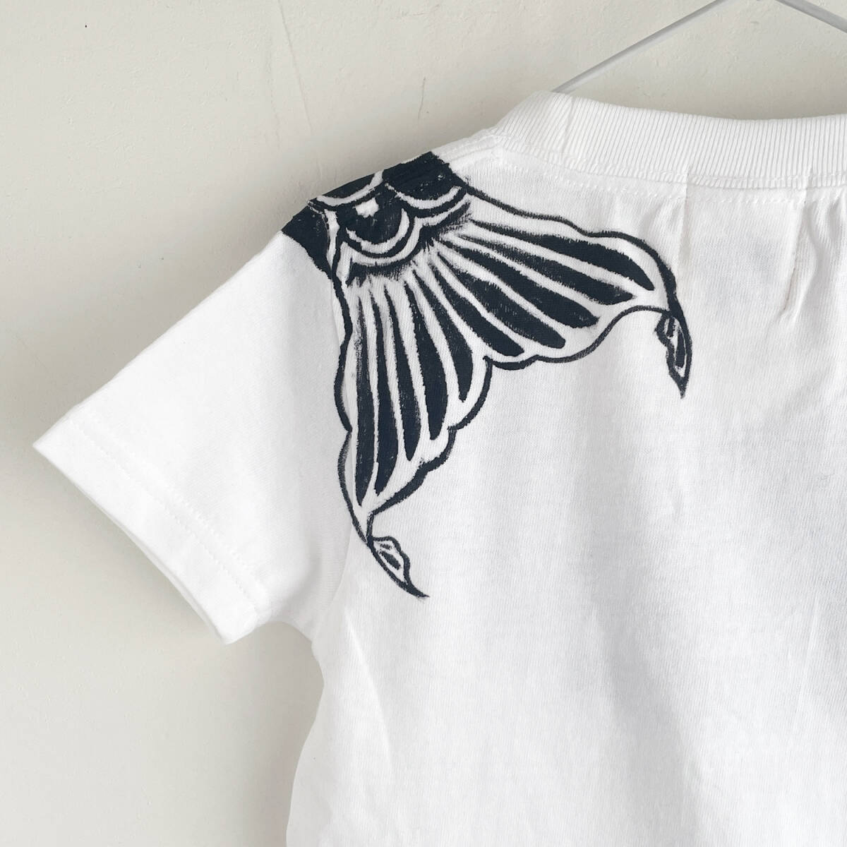 ご覧いただきありがとうございます。 一つ一つ丁寧に手描きで絵付けし、筆跡やカスレなどがプリントTシャツとは一味ちがう手描きならではの味わいとなっております。 日本的な物や和柄が好きな方、誕生日プレゼントやちょっとしたギフトにもおすすめの一枚です。 カラー:ホワイト サイズ:140 140:身丈55㎝ 身幅40㎝ 肩幅36㎝ 袖丈16㎝ ※ 90サイズには方部分に樹脂製のスナップボタンがつきます、それ以外のサイズにはボタンはつきません。 素材:綿100% Tシャツ素材について:5.6オンス 胴仕上げ 首リブはダブルステッチ しっかりふっくらとした生地のハイクオリティなTシャツ、繰り返しの洗濯にもよれないコシのあるリブはTシャツ好きさんには納得していただける素材のTシャツを使用しております。 | |||