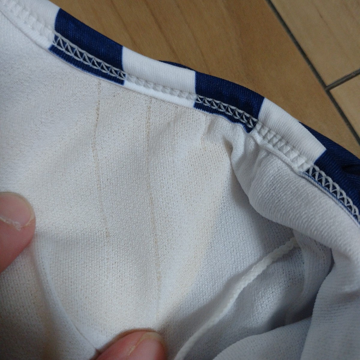 つるっとした生地です。パットポケットあり。出し入れ可能のパット入り。調節ストラップ。パンツが中にくっ付いています(画像3参照)。新品ですがほつれがあります(画像4参照)。