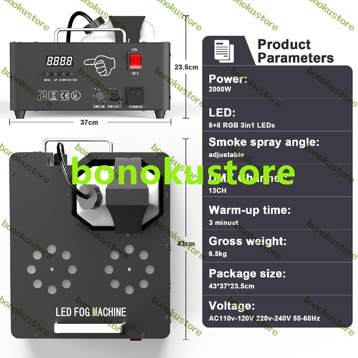 名前: 垂直スモークマシン 電圧: AC110v-120V 220v-240V 50-60Hz 電力: 2000W LED: 8+8 RGB 煙の噴射角度: 調整可能 DMXチャンネル:13CH 制御モード: DMX 制御、リモート制御、DMX512、手動制御 任意の色を混合でき、2 セットの LED が異なる色を発光可能 ウォームアップ時間: 3 分 パッケージ: スモークマシン×1 電源コード×1 信号線×1 リモコン×1 コーンニードル×1 取扱説明書×1