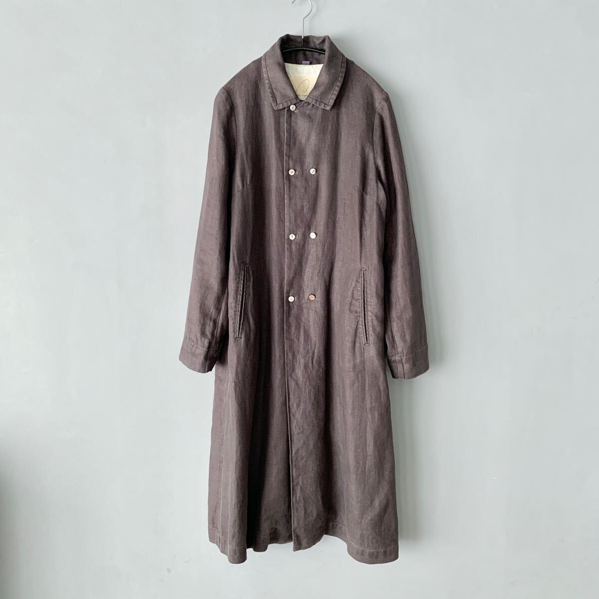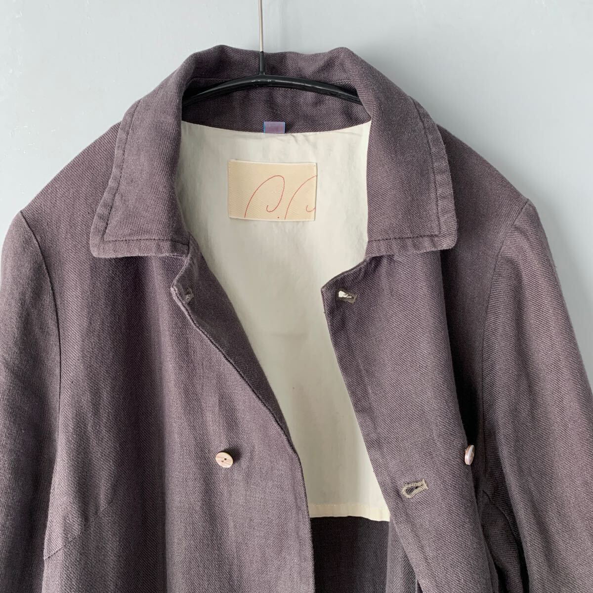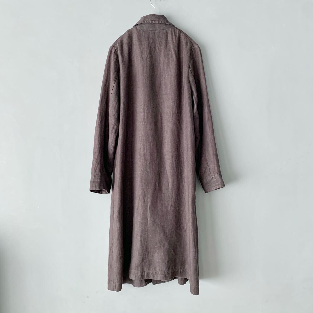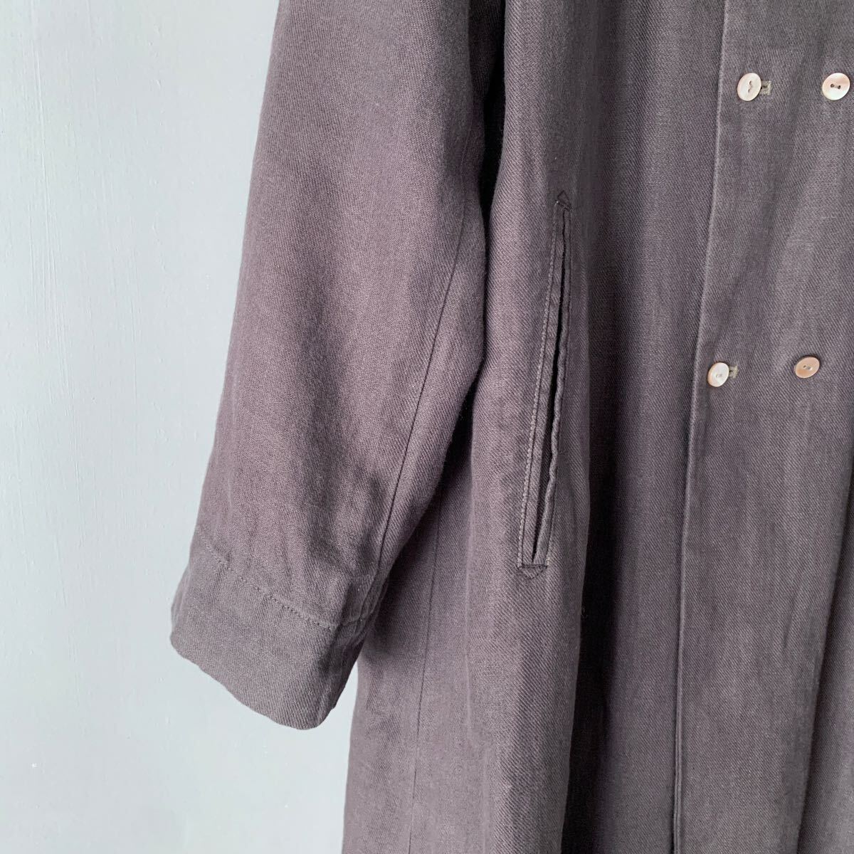 パラスパレス のリネンコートです。シャツで使われるくらいの小さなボタンを使ったダブルフロントです。とても肌触りの良いストール生地のようなリネン生地がつかわれています。