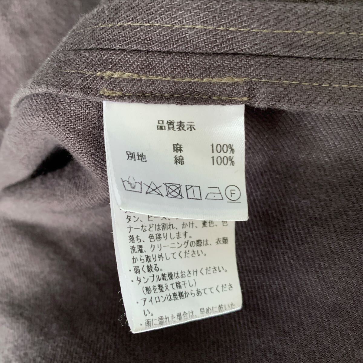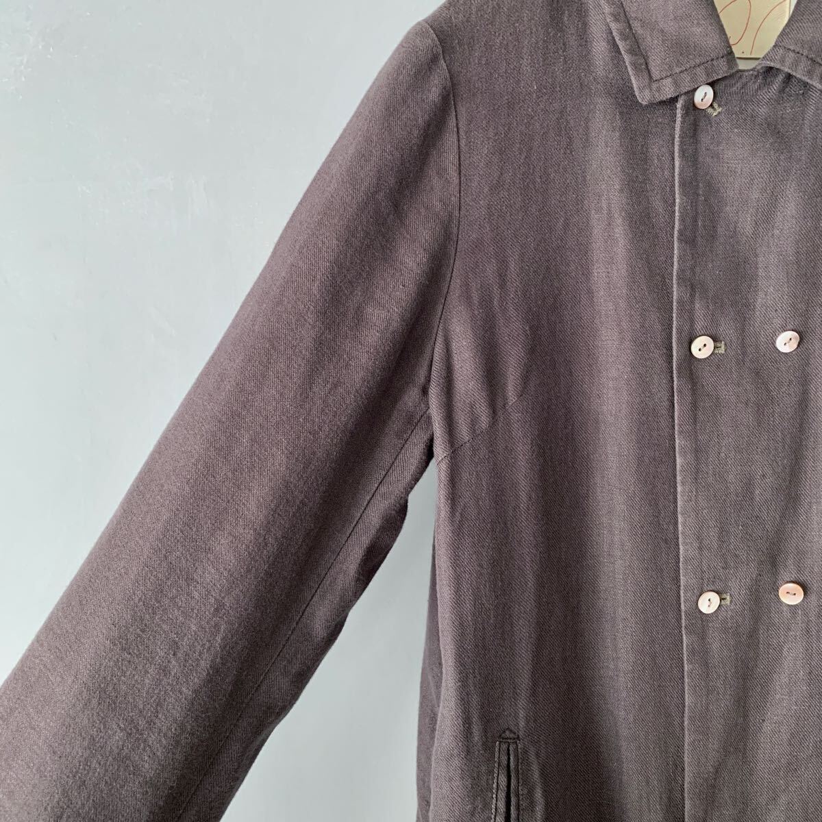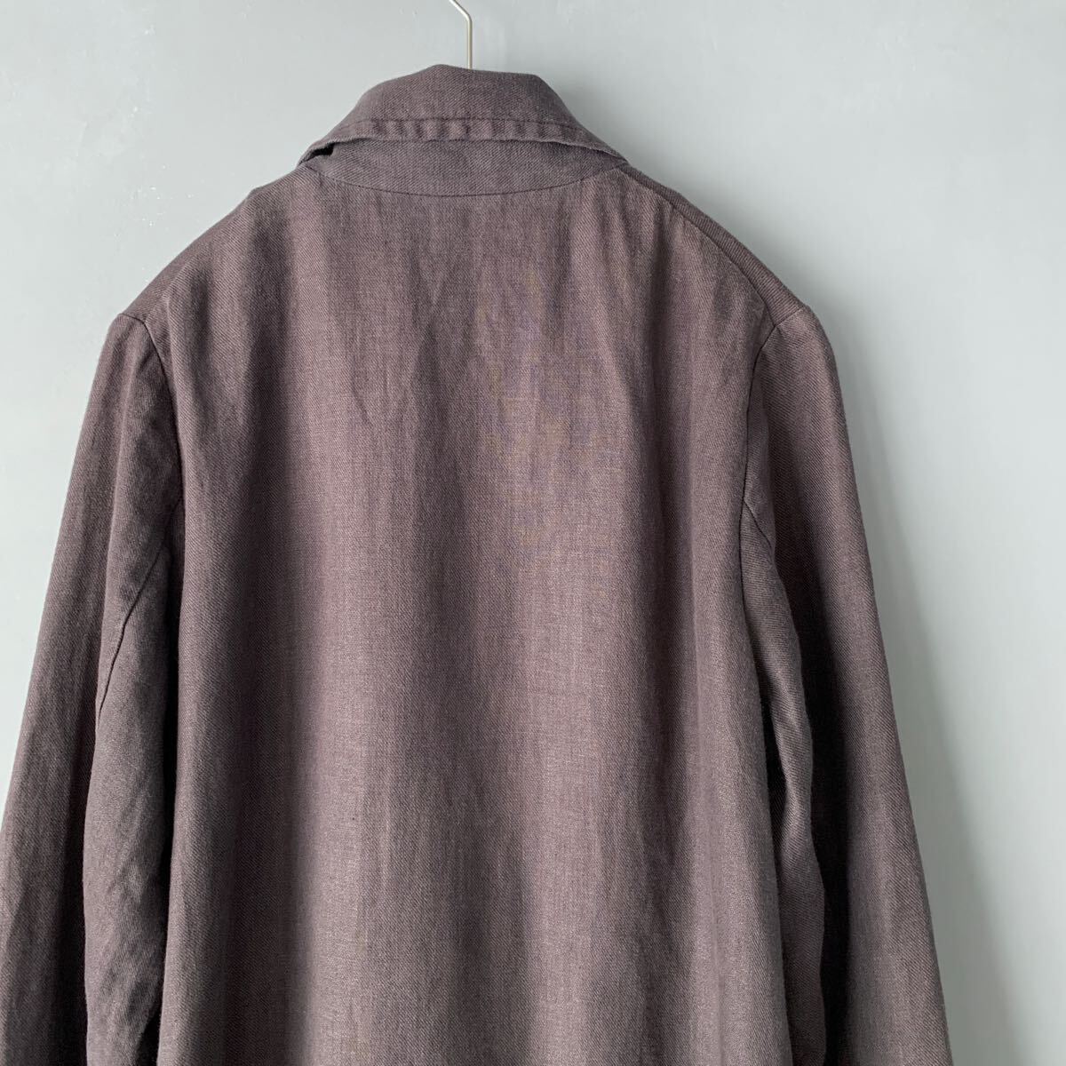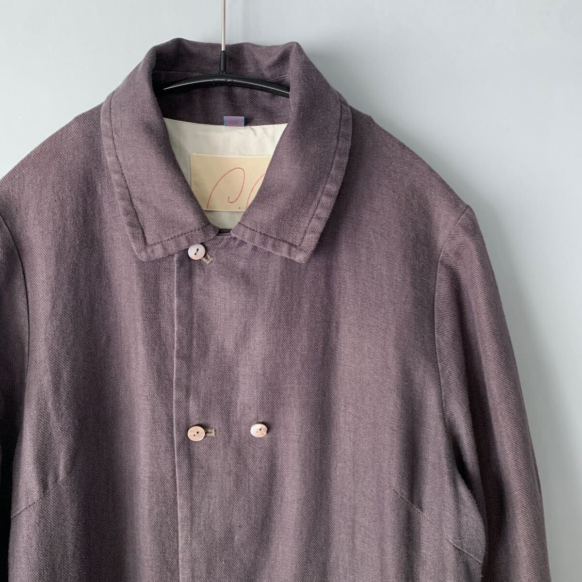 パラスパレス のリネンコートです。シャツで使われるくらいの小さなボタンを使ったダブルフロントです。とても肌触りの良いストール生地のようなリネン生地がつかわれています。