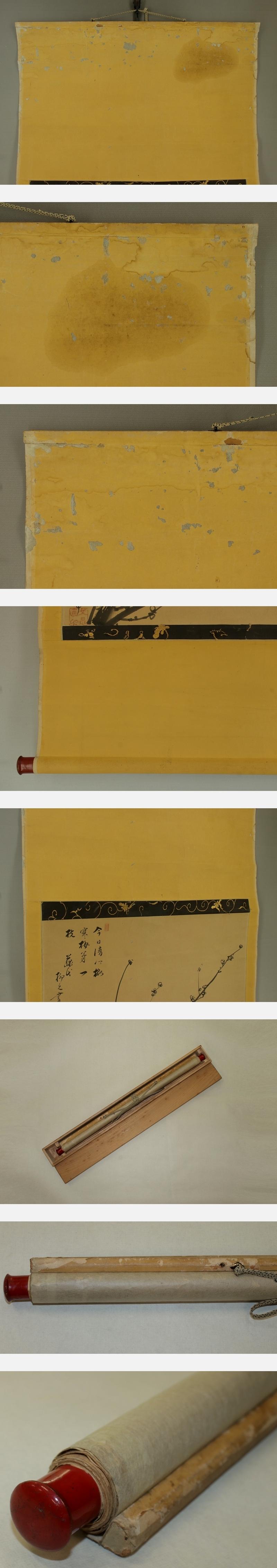 谷文晁 たに-ぶんちょう(1763-1841) 江戸時代後期の画家。 宝暦13年9月9日生まれ。谷麓谷の長男。加藤文麗,渡辺玄対らに師事。 狩野派,土佐派,南宗画,北宗画,西洋画などの手法を取り入れて独自の画風を創出, 江戸文人画壇の重鎮となる。田安徳川家に仕え,松平定信編「集古十種」の挿絵も描く。 渡辺崋山ら門人多数。天保11年12月14日死去。78歳。江戸出身。 通称は文五郎。別号に写山楼,画学斎など。 本紙は、染み、汚れ、強い折れ、皺、虫食い、修理痕があります。 表装は、染み、汚れ、強い折れ、皺、虫食い、破れ、生地剥れ、修理痕があります。 【サイズ】 作品 横約58.5cm×縦約37.5cm 表装 横約66cm×縦約106cm |