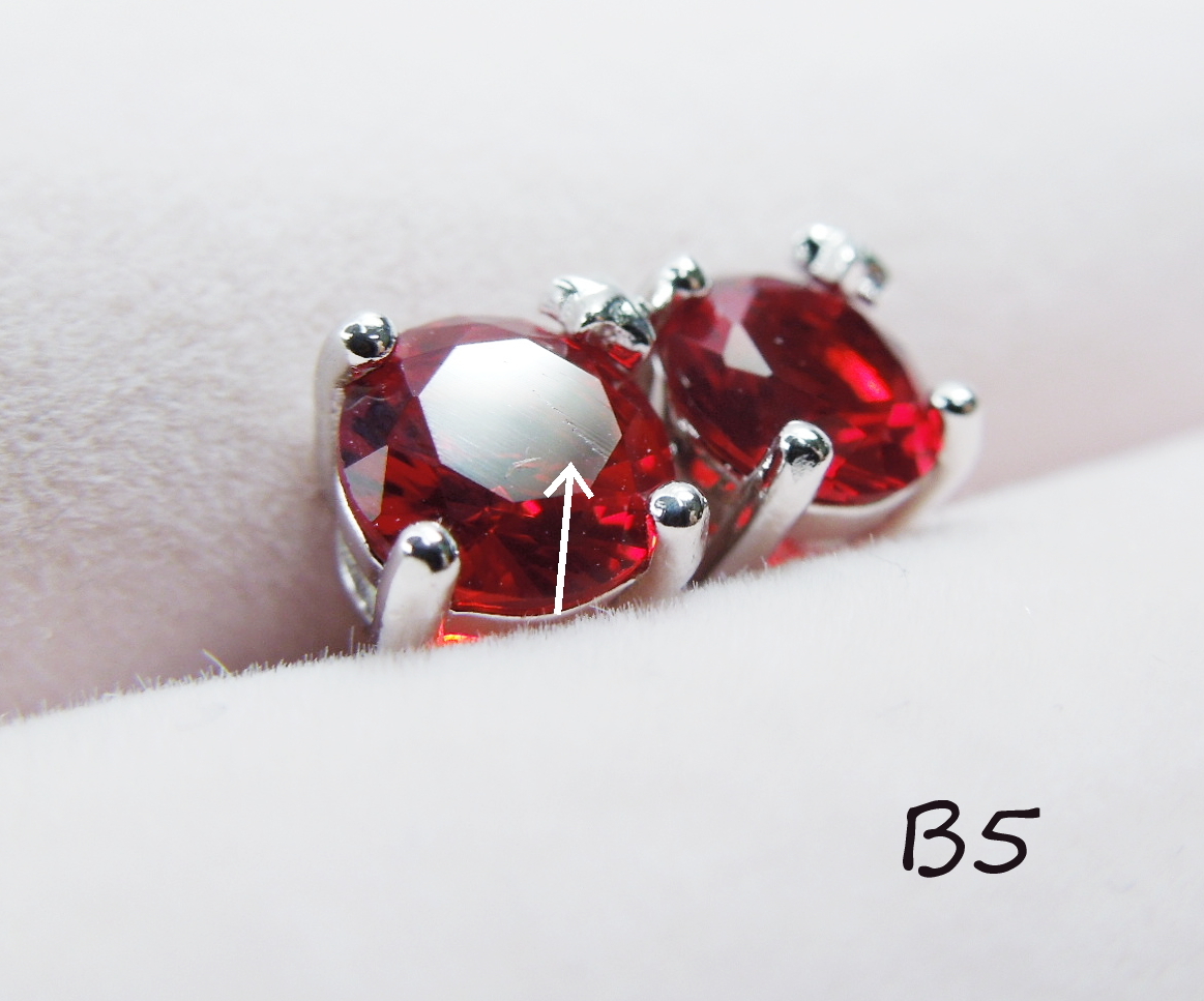 1点のみ。新品 人工ルビーペアピアスです。新品未使用ですが、画像矢印部分、わずかにストーン削りムラございますので、お安め価格にて販売中です。画像の実物をお届けします。