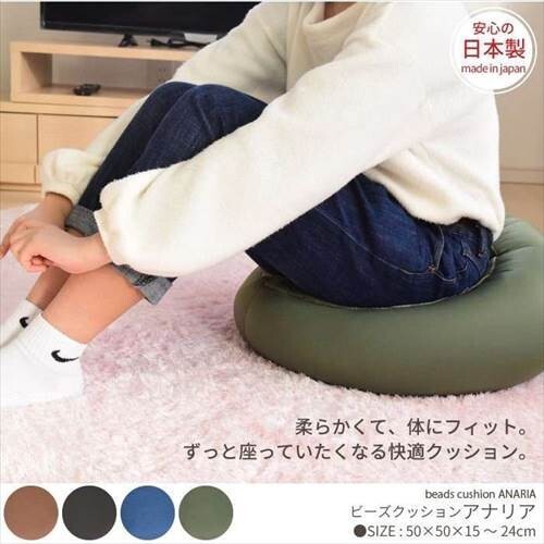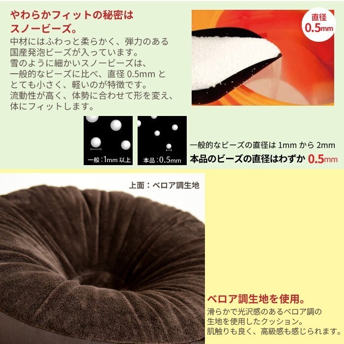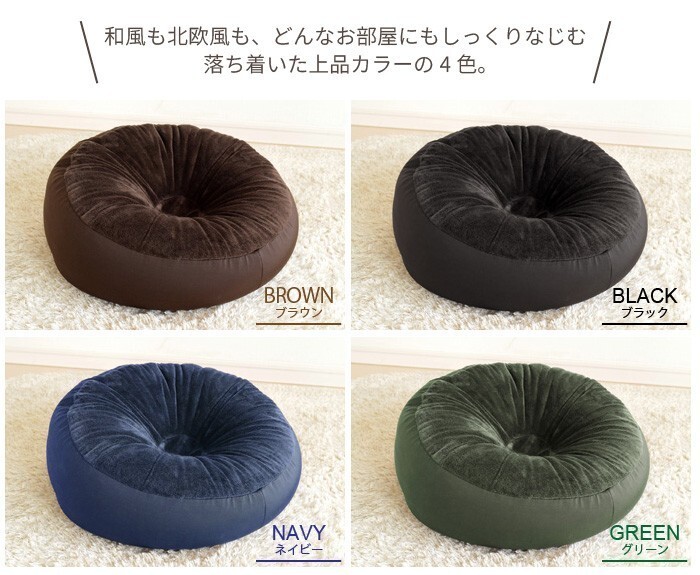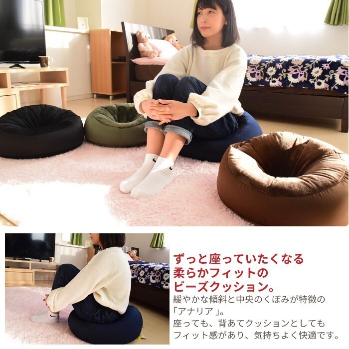 商品説明 | 座った瞬間に身体にフィットする超極小発砲ビーズを使用したビーズクッション。 【仕様】 ■サイズ:約50×50×15~24cm ■重量:約0.74kg ■素材:[表底地]ベルボア(ポリエステル100%) [脇地]ポリエステル85%、ポリウレタン15% [中材]発砲ビーズ0.5mm [キルト]表に放射状のキルト ■カラー:ブラウン、ブラック、ネイビー、グリーン |