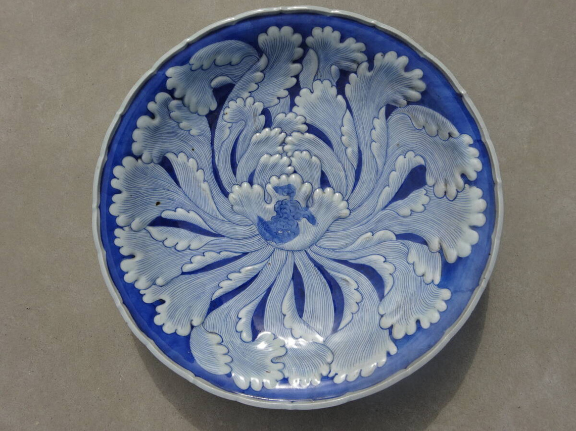 古伊万里 染付 陽刻 唐獅子 牡丹図 大飾皿 大皿