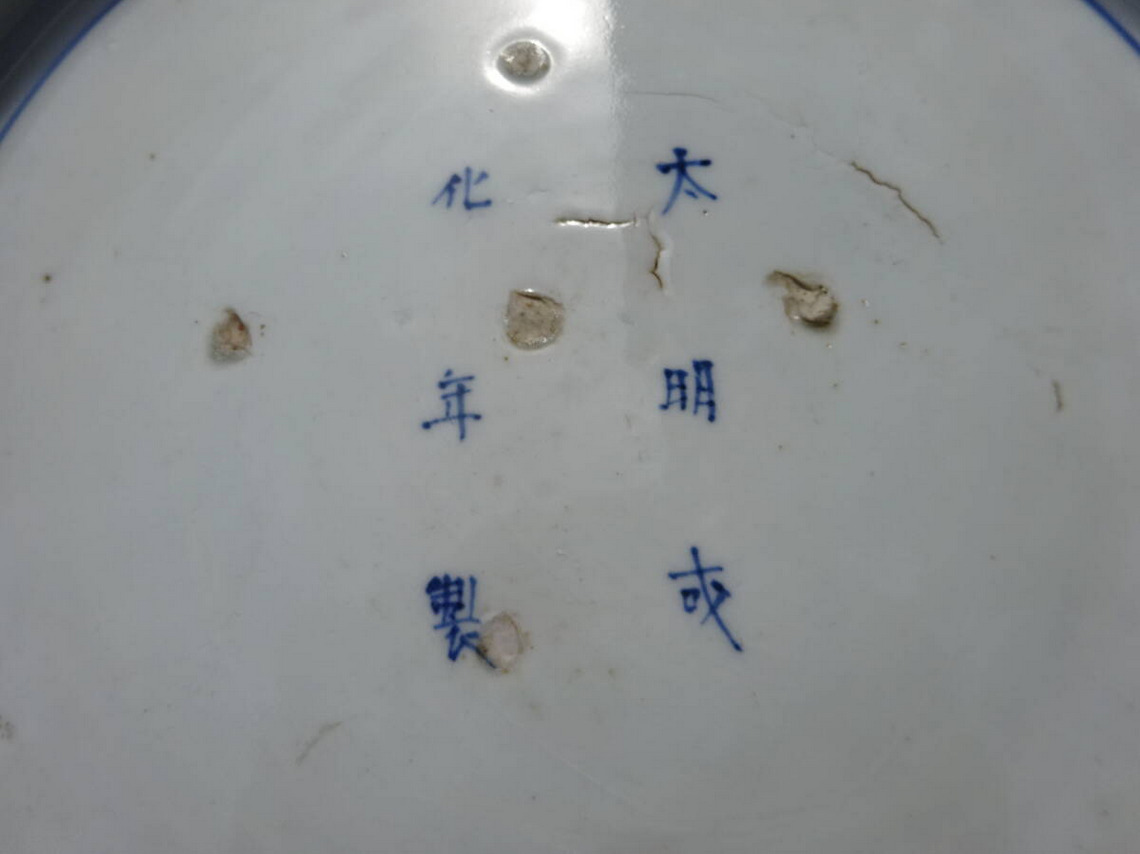 古伊万里 染付 陽刻 唐獅子 牡丹図 大飾皿 大皿 42.5cm 大明成化年製 江戸期 時代物