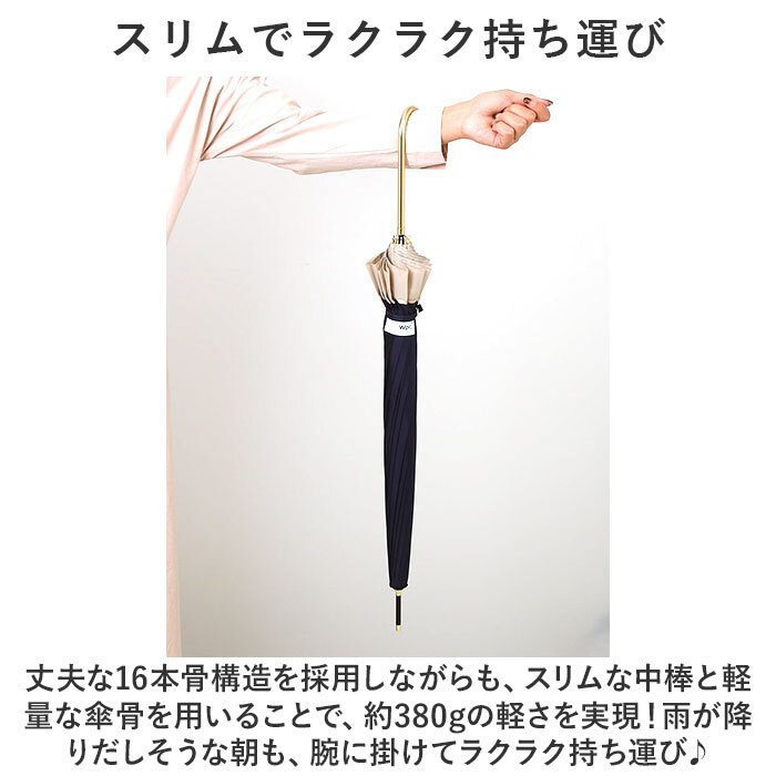 商品説明 | ・・上品さと可愛らしさを同時に叶える“美シルエット”。雨の日の“大人可愛い”を応援する「Wpc.」から、「レディース 16本骨アンブレラ(親骨54cm・55cmタイプ)」が新登場。(※1) ・【雨風に強い16本骨構造】 ・通常の傘よりも骨数の多い耐風性に優れた16本骨仕様で、雨風の強い日でも安心。円を描くような美しいシルエットが特徴。 ・【軽くて、しなやか、折れにくい】 ・親骨と受け骨には、強い風でもしなやかに受け止めるグラスファイバー素材を使用。丈夫で折れにくいのにふわっと軽い差し心地。 ・【スリムでラクラク持ち運び】 ・丈夫な16本骨構造を採用しながらも、スリムな中棒と軽量な傘骨を用いることで、約380gの軽さを実現!雨が降りだしそうな朝も、腕に掛けてラクラク持ち運び♪ ・【雨の日も晴れの日も大活躍】 ・紫外線防止効果のある傘生地が、日射しとともに降り注ぐ紫外線をカット(※2)。雨の日にはもちろん、晴れの日にも頼りになる1本に。(※淡色:約80%、濃色:約90%) ・【スムーズな手開きタイプ】 ・開閉時の動作に上品さがほのかに漂う、混雑した場所でもスマートに開くことのできる手開きタイプ。 ・【安全カバー付きで安心】 ・傘を閉じる時に爪や指を挟む心配のない安全ろくろカバー付きなので、ネイルアートを施した指先でも安心。 ・【たたむ時も手間取らない!】 ・玄関に入るときに傘生地がサッとまとめやすい、スナップボタン式の留めバンドを採用。「Wpc」のピスネームと、ロゴが刻印されたゴールド色のカシメがアクセント。 ・【傘を持つ指先に華やかさをプラス】 ・ビンテージ感のあるアルミゴールドで仕上げたハンドルは、女性らしい繊細な指先をさりげなく演出する華奢なデザイン。 ・【雨空に花咲くシンプルカラー】 ・シンプルながらもクラシカルな雰囲気を醸し出す、コーディネート自在で上品なカラーバリエーションも魅力のひとつ。 |