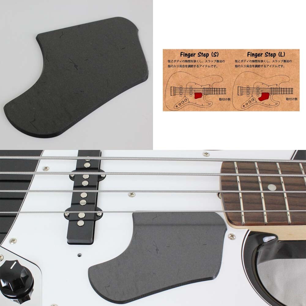 「Finger Step」はピックガードと同素材でできており、両面テープ(別売)で弦とボディの間に固定することにより、一段隙間が埋まります。それによってプル(人差し指で弦を弾く奏法)がし易くなり早いパッセージにも対応できるようになります。
