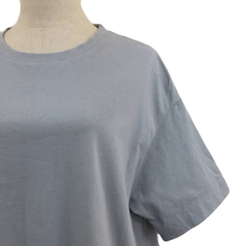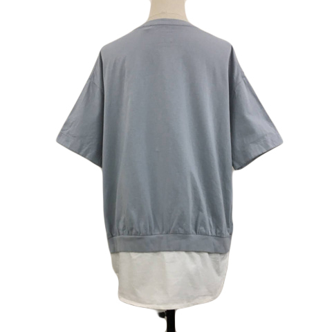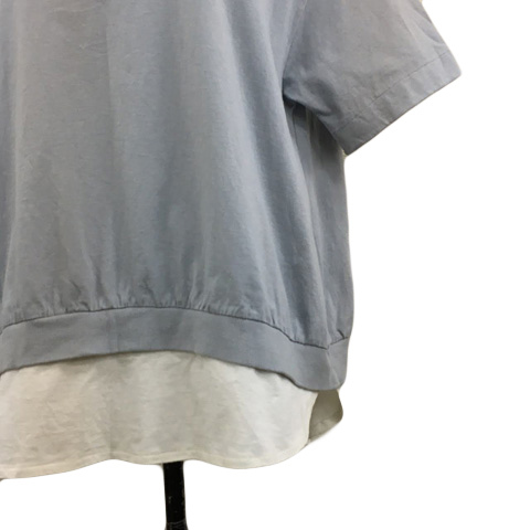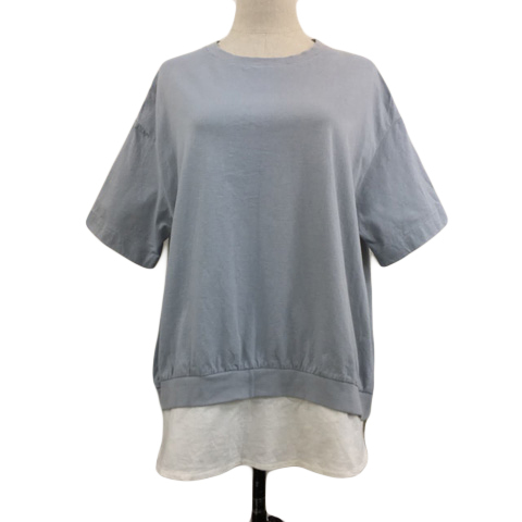 グローバルワーク カットソー プルオーバー ラウンドネック 切替 レイヤード風 無地 五分袖 M 水色 白 ライトブルー ホワイト レディース