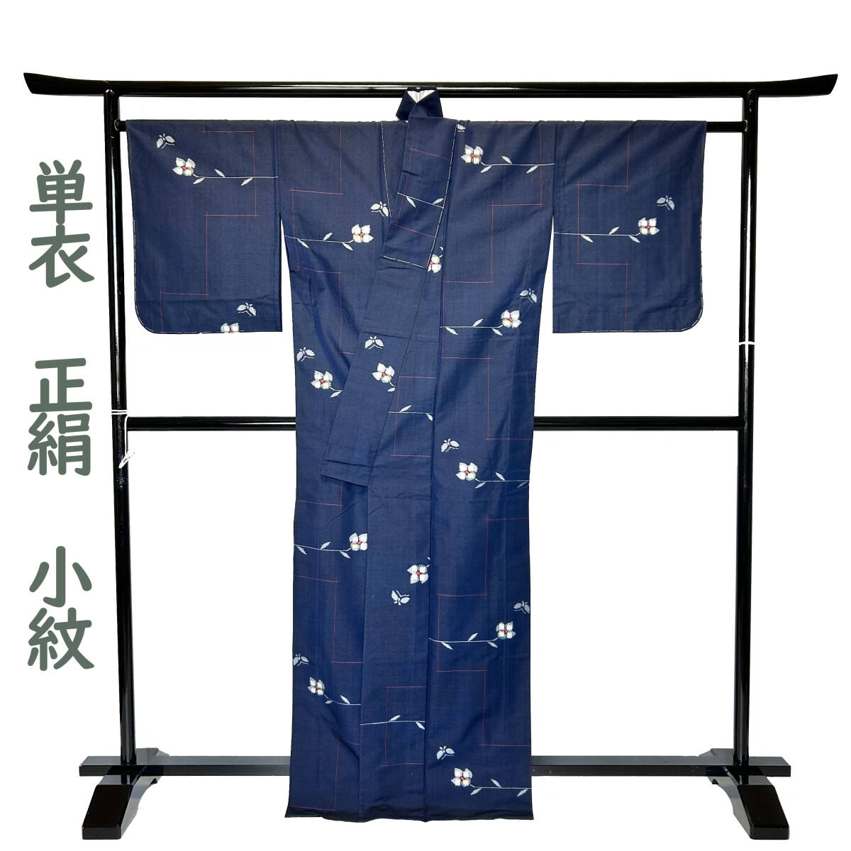 ★着物 単衣 正絹 小紋 紬 夏用 カジュアル 花と蝶 紺色 中古 仕立て上り Mサイズ  送料無料★