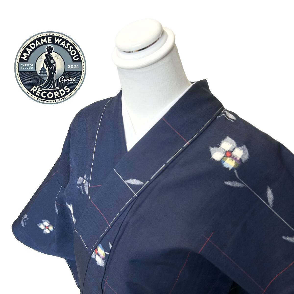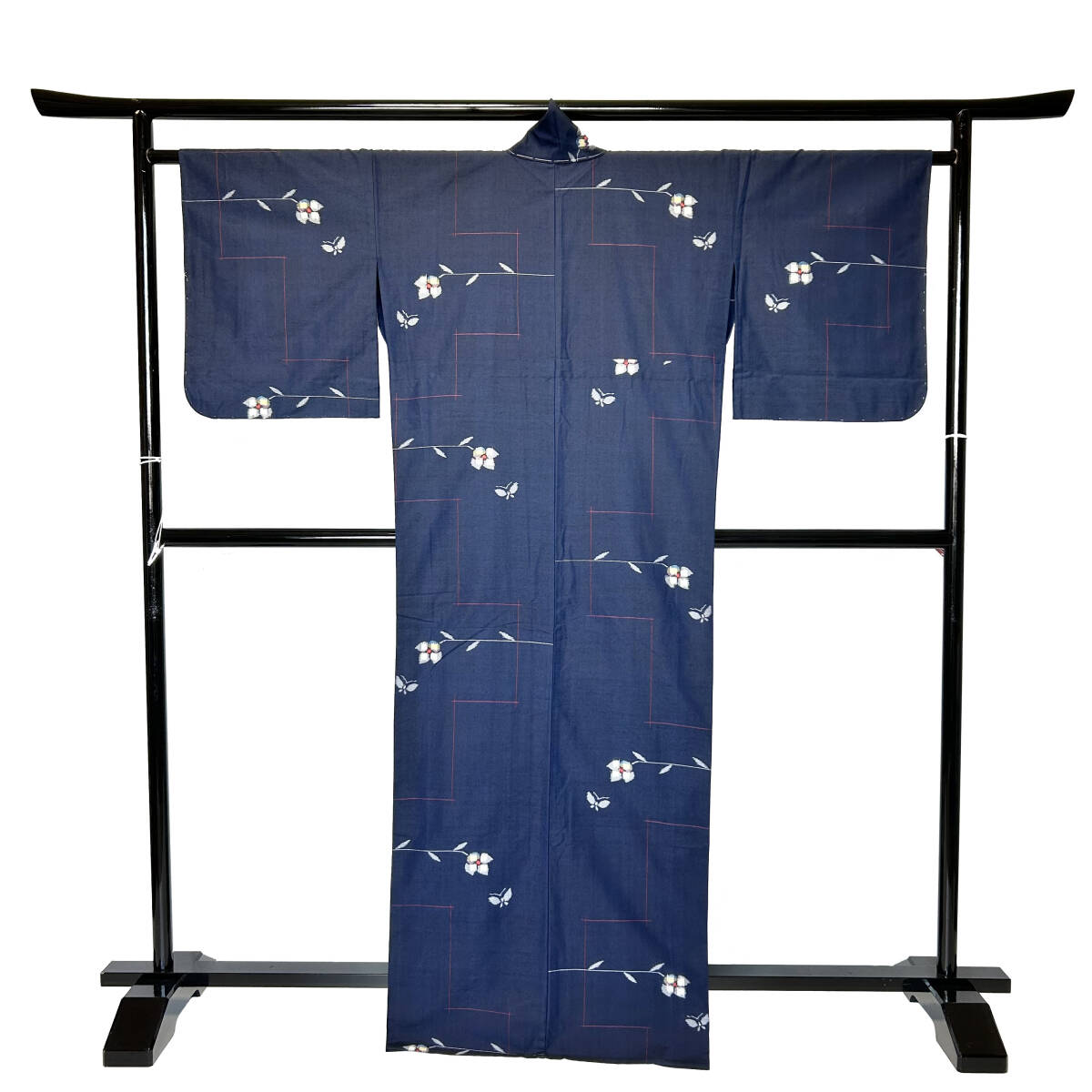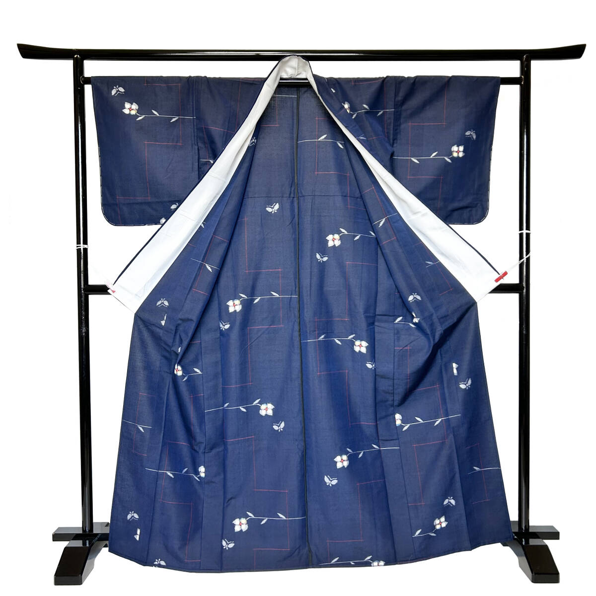 着物 単衣 正絹 小紋 紬 夏用 カジュアル 花と蝶 紺色 中古 仕立て上り Mサイズ MWR-No.066 16042025 マダム 和装