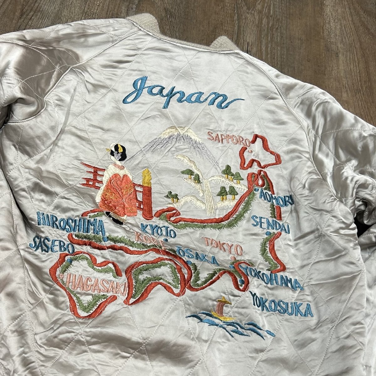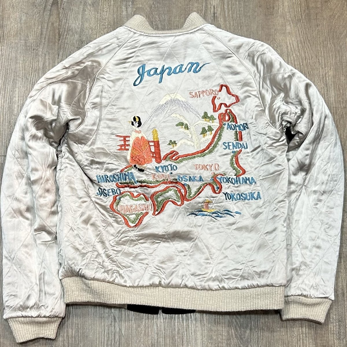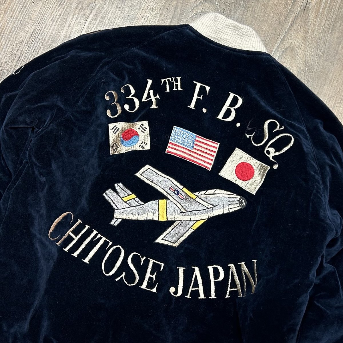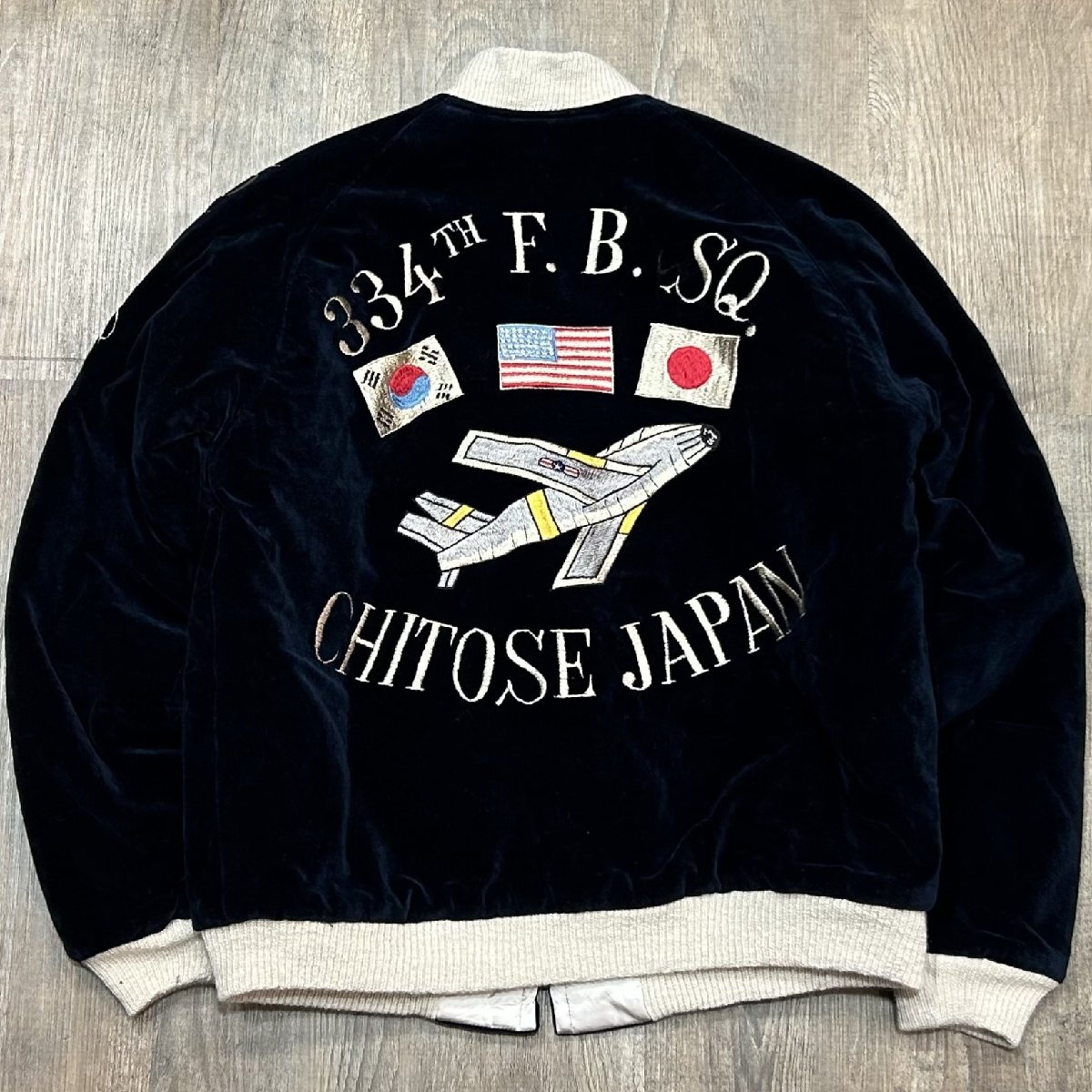 1950年代当時、日本国内の米軍基地周辺には、卓越した手振りの刺繍技術を持つ刺繍店が点在しており、日本へ駐在した米兵達はこぞって刺繍店へと足を運んでは“スカジャン”を特別にオーダーした。その背景には当時の為替相場が1ドル=360円であり、彼ら兵士達にとってみれば非常に安価で豪華な刺繍を施すことが出来た。こうしてスカジャン文化が開花して隆盛を極めて行った。朝鮮戦争が勃発すると、1950年代初頭から日本の入間や千歳、三沢に展開した第4爆撃戦闘航空団の第334爆撃戦闘飛行隊“イーグルス”。フロントには所有者“チャック”が所属したイーグルスの部隊章が輝いているが、正規の部隊章とは若干違ったローカルメイドならではの風合いが存分に生かされている。左袖に入った年号もレア度が高い。背面に施された刺繍は当時配備された最新鋭ジェット機、F-86セーバーと、韓国、アメリカ、日本の平和を願う思いが刺繍に込められている。戦争が終結するまで敵機を5機以上撃墜した米軍全体のF-86ジェットエースは39人に達し、その中で第4爆撃戦闘航空団から25人ものパイロットを輩出、輝かしい戦果を残した名門部隊である。リバーシブル面の身頃は、シルバー一色使いにカラフルな色糸で刺繍が施されているため、ジャパンマップと佇んだ舞妓が一層際立っている。マップに散りばめられた地名の“NAGASAKI”のNがHに変わっているのは当時間違えて刺繍されたそのままのご愛嬌。