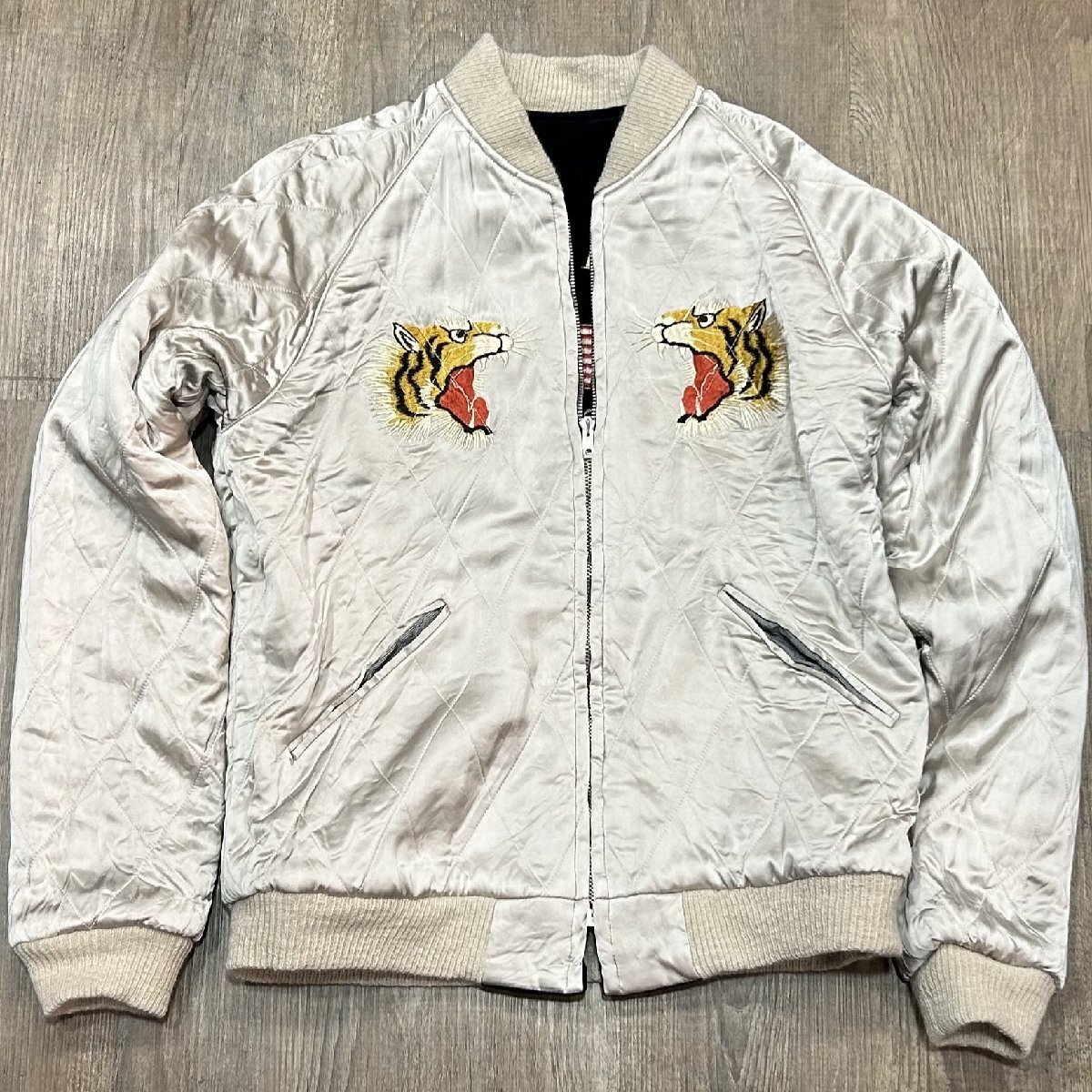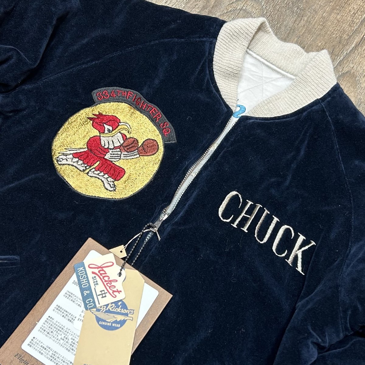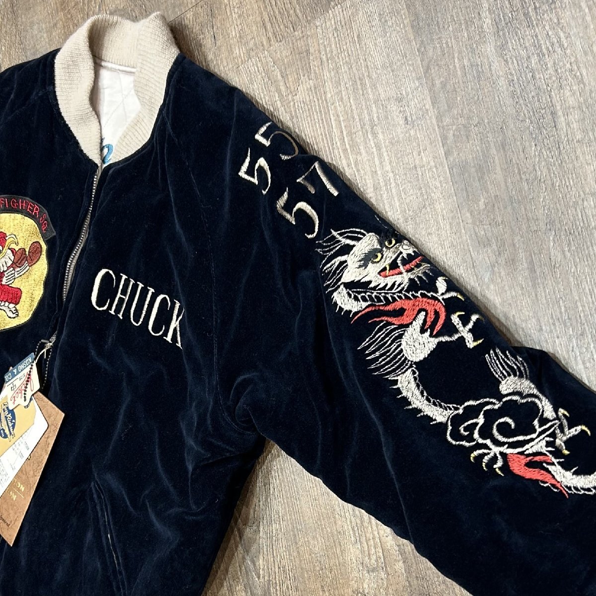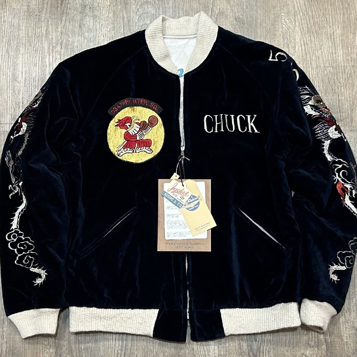 1950年代当時、日本国内の米軍基地周辺には、卓越した手振りの刺繍技術を持つ刺繍店が点在しており、日本へ駐在した米兵達はこぞって刺繍店へと足を運んでは“スカジャン”を特別にオーダーした。その背景には当時の為替相場が1ドル=360円であり、彼ら兵士達にとってみれば非常に安価で豪華な刺繍を施すことが出来た。こうしてスカジャン文化が開花して隆盛を極めて行った。朝鮮戦争が勃発すると、1950年代初頭から日本の入間や千歳、三沢に展開した第4爆撃戦闘航空団の第334爆撃戦闘飛行隊“イーグルス”。フロントには所有者“チャック”が所属したイーグルスの部隊章が輝いているが、正規の部隊章とは若干違ったローカルメイドならではの風合いが存分に生かされている。左袖に入った年号もレア度が高い。背面に施された刺繍は当時配備された最新鋭ジェット機、F-86セーバーと、韓国、アメリカ、日本の平和を願う思いが刺繍に込められている。戦争が終結するまで敵機を5機以上撃墜した米軍全体のF-86ジェットエースは39人に達し、その中で第4爆撃戦闘航空団から25人ものパイロットを輩出、輝かしい戦果を残した名門部隊である。リバーシブル面の身頃は、シルバー一色使いにカラフルな色糸で刺繍が施されているため、ジャパンマップと佇んだ舞妓が一層際立っている。マップに散りばめられた地名の“NAGASAKI”のNがHに変わっているのは当時間違えて刺繍されたそのままのご愛嬌。