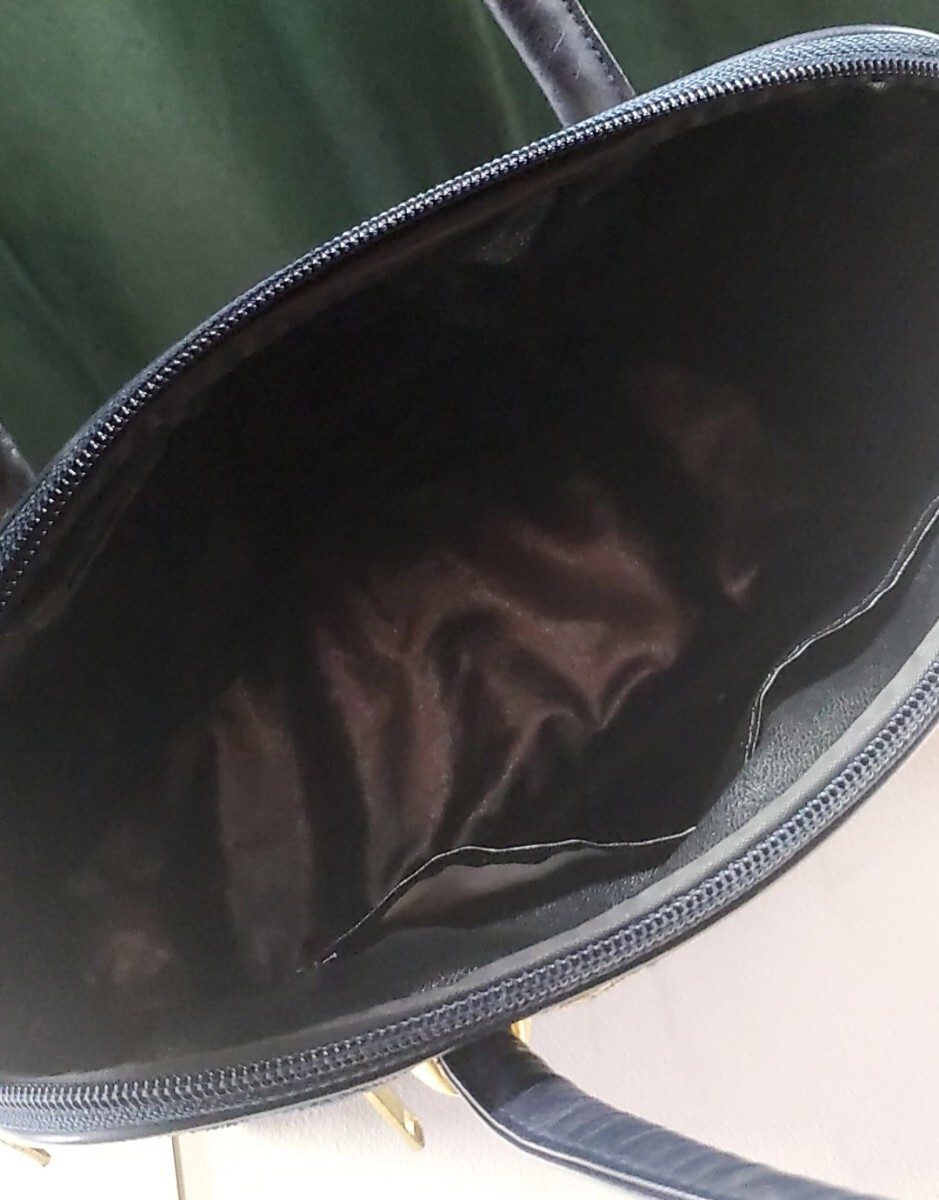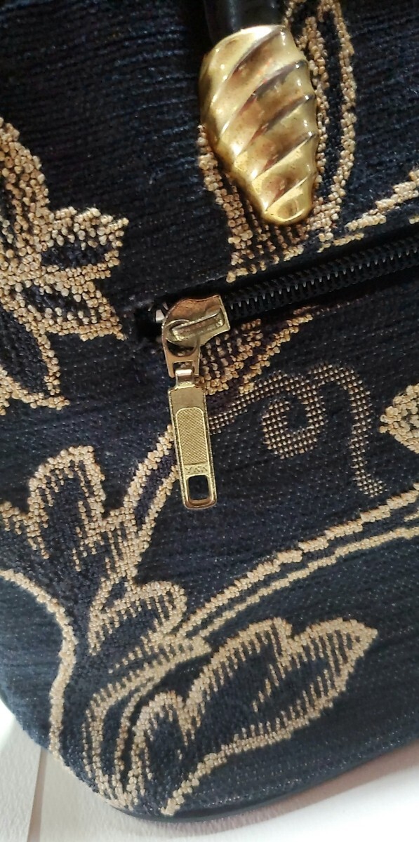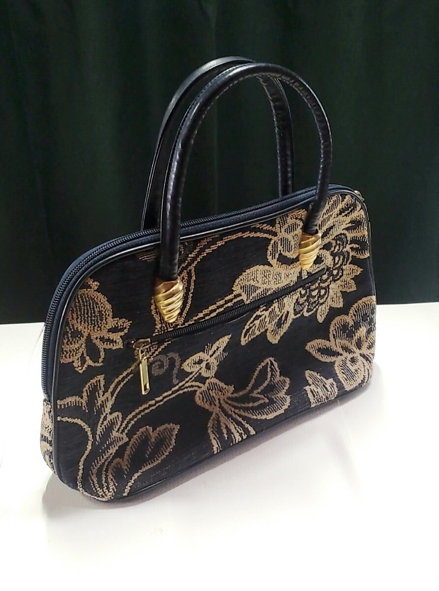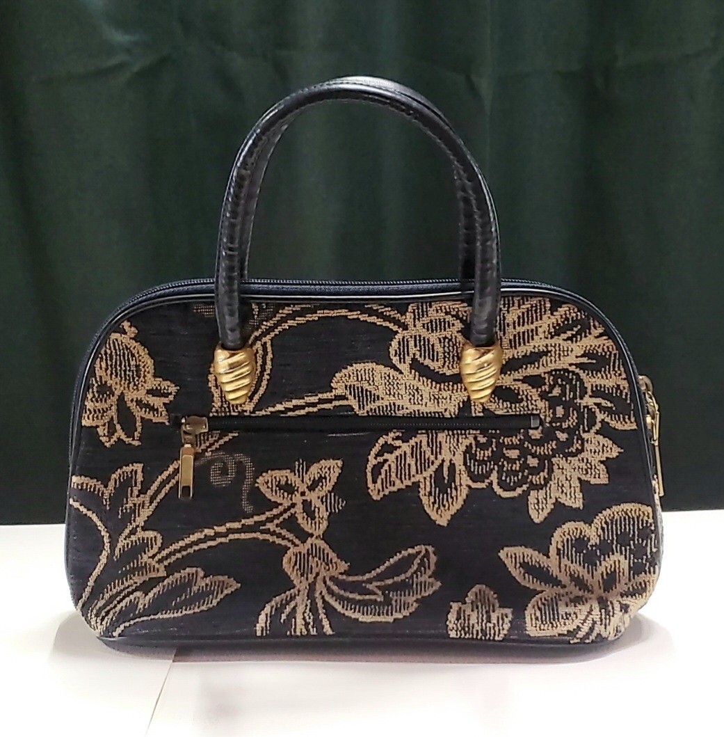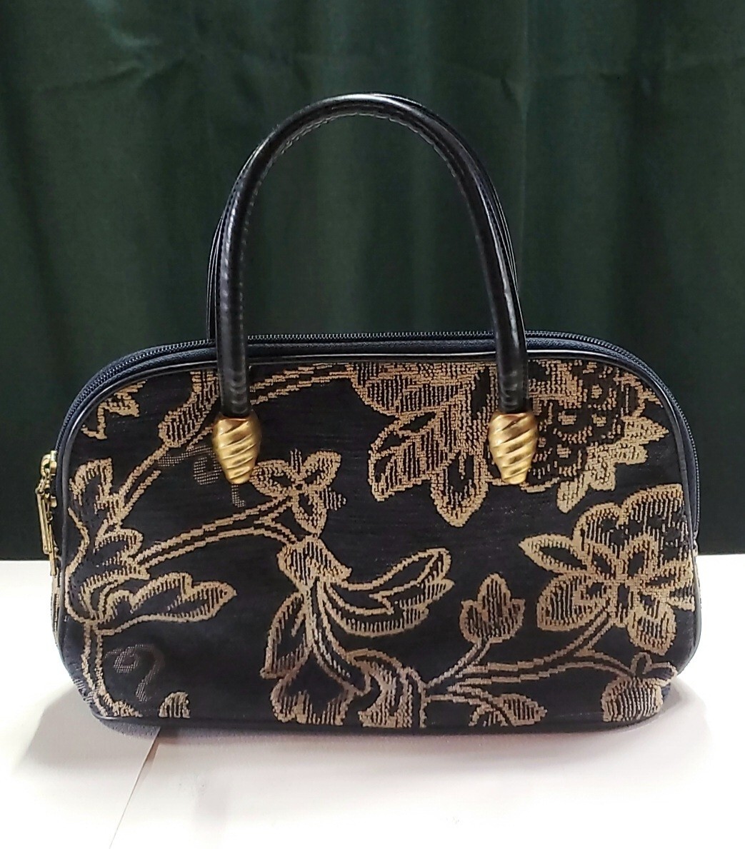 母親が所有していましたゴブラン織り ハンドバッグです。長く保管されていた品ですが、底面にややスリキズ、裏生地に微少な変色といった経年による多少の使用感を伴います。