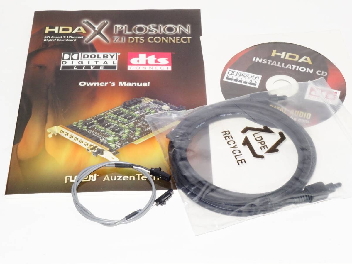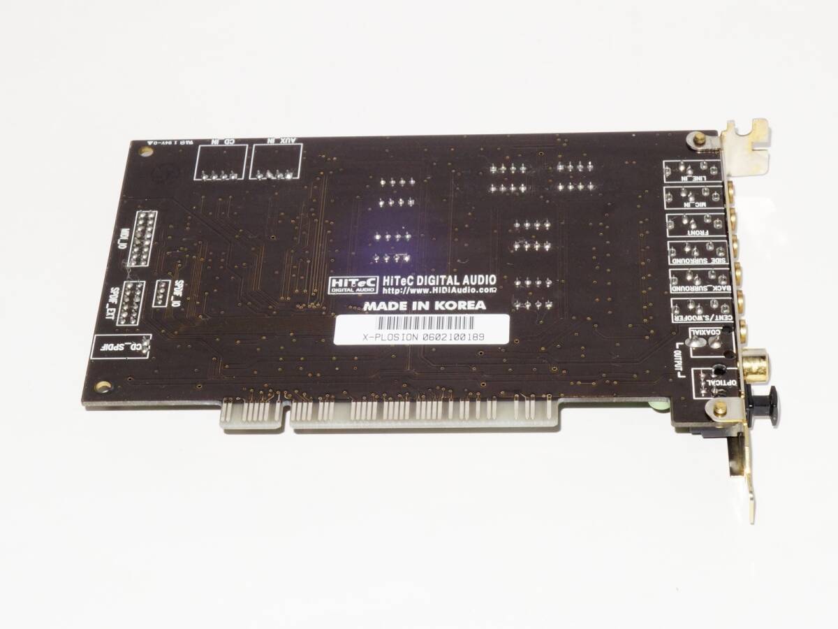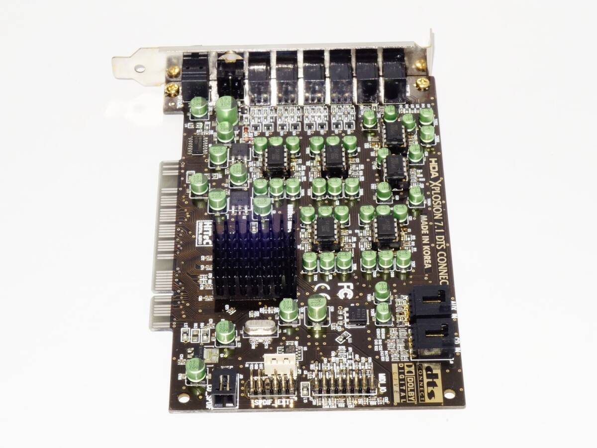 Auzentechが出している PCI接続のサウンドカードで C-Mediaチップ「CMI8770」を搭載した 「HDA X-Plosion 7.1 DTS Connect」 公式はWindows7までの対応ですが 通常オーディオとしてWindows10 64bitでの 動作もきちんと確認しております。 (音量が低くなってしまうと言う問題あり) 小型のステレオミニ端子からの出力 光の出力の赤色と入力からの 再生での音も確認済み |