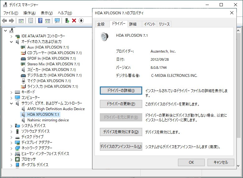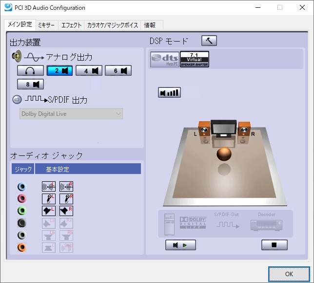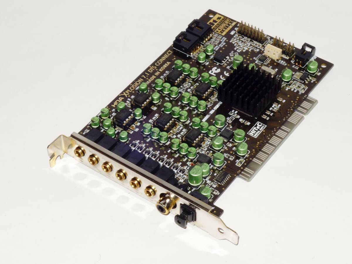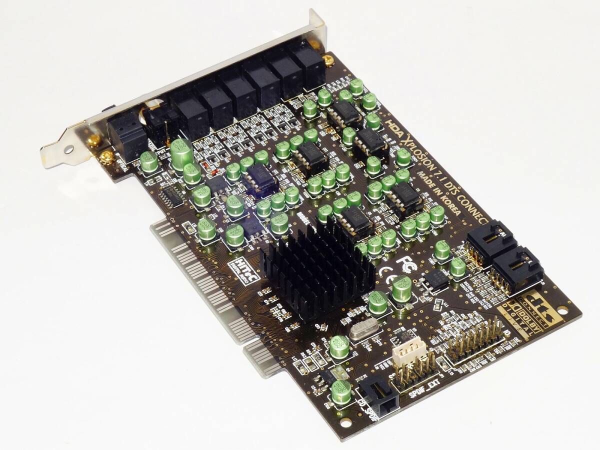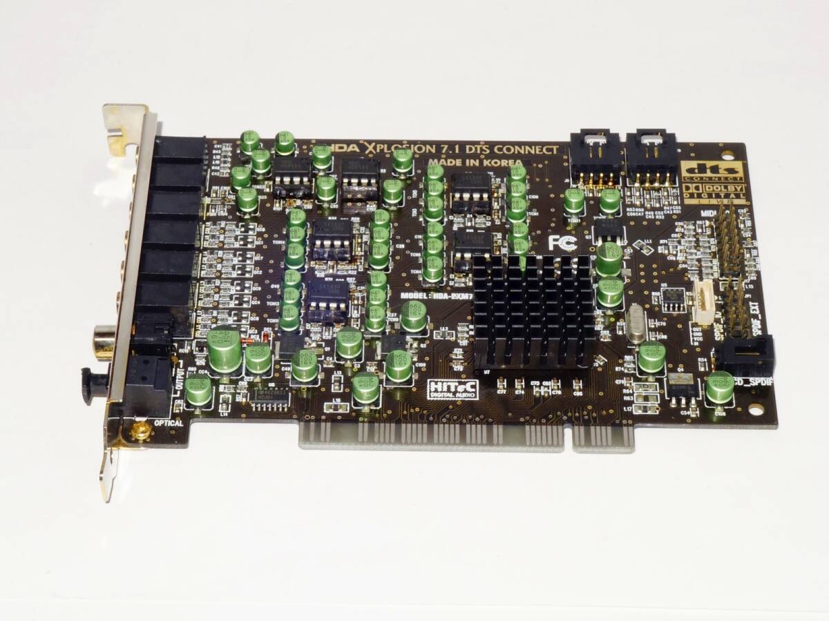 Auzentechが出している PCI接続のサウンドカードで C-Mediaチップ「CMI8770」を搭載した 「HDA X-Plosion 7.1 DTS Connect」 公式はWindows7までの対応ですが 通常オーディオとしてWindows10 64bitでの 動作もきちんと確認しております。 (音量が低くなってしまうと言う問題あり) 小型のステレオミニ端子からの出力 光の出力の赤色と入力からの 再生での音も確認済み |