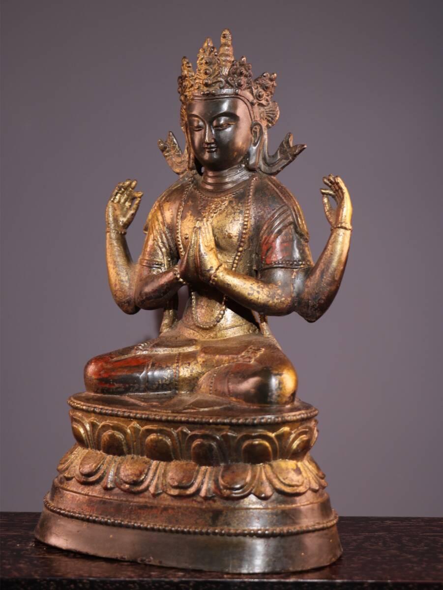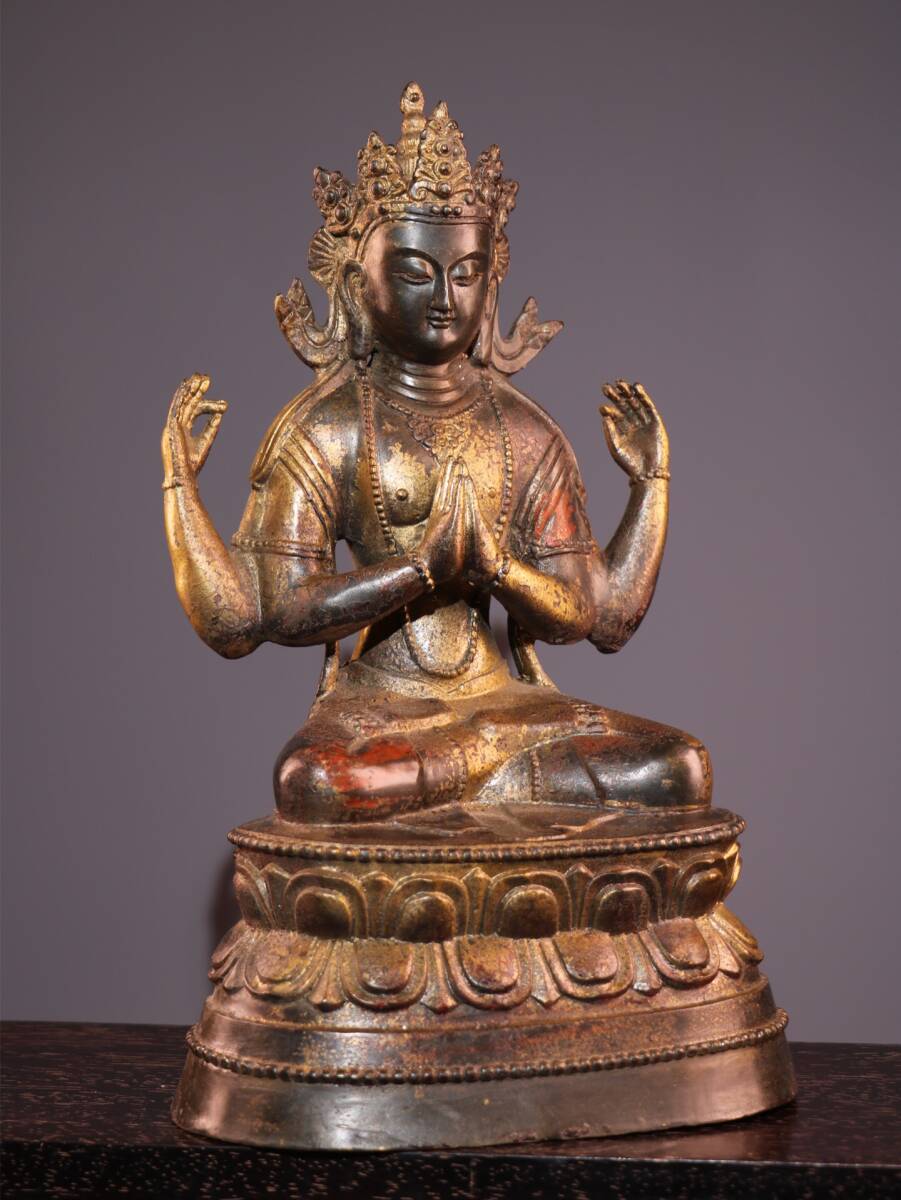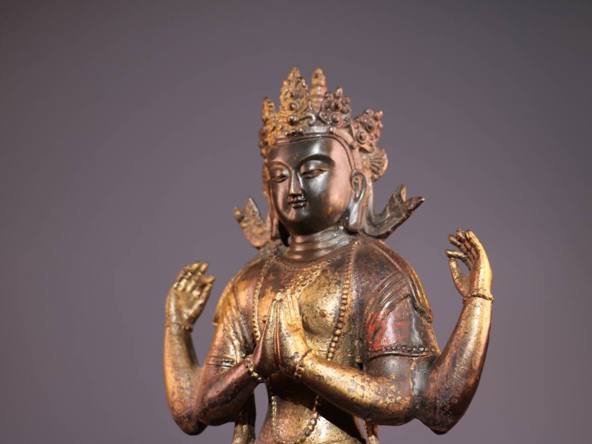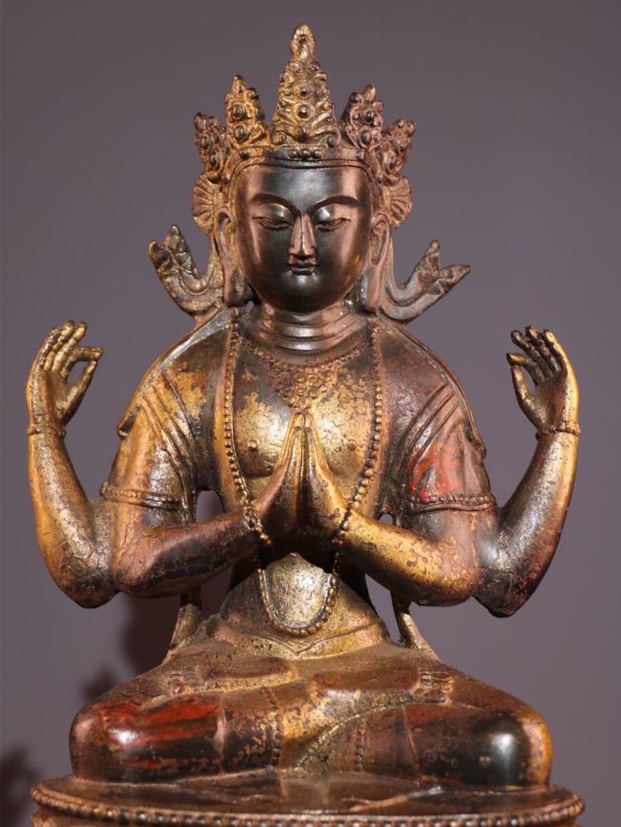 【超珍館蔵】銅製 泥金 朱砂 四臂觀音像 仏教古美術 供養品 古賞物 古美術品 稀少珍蔵品
