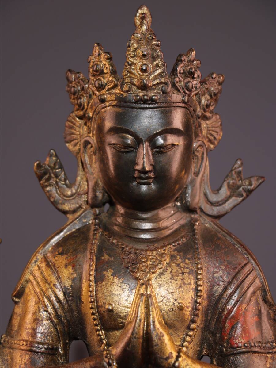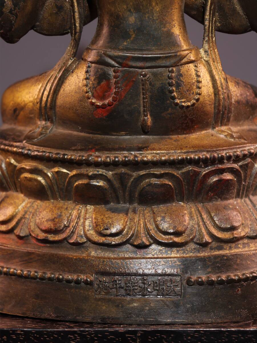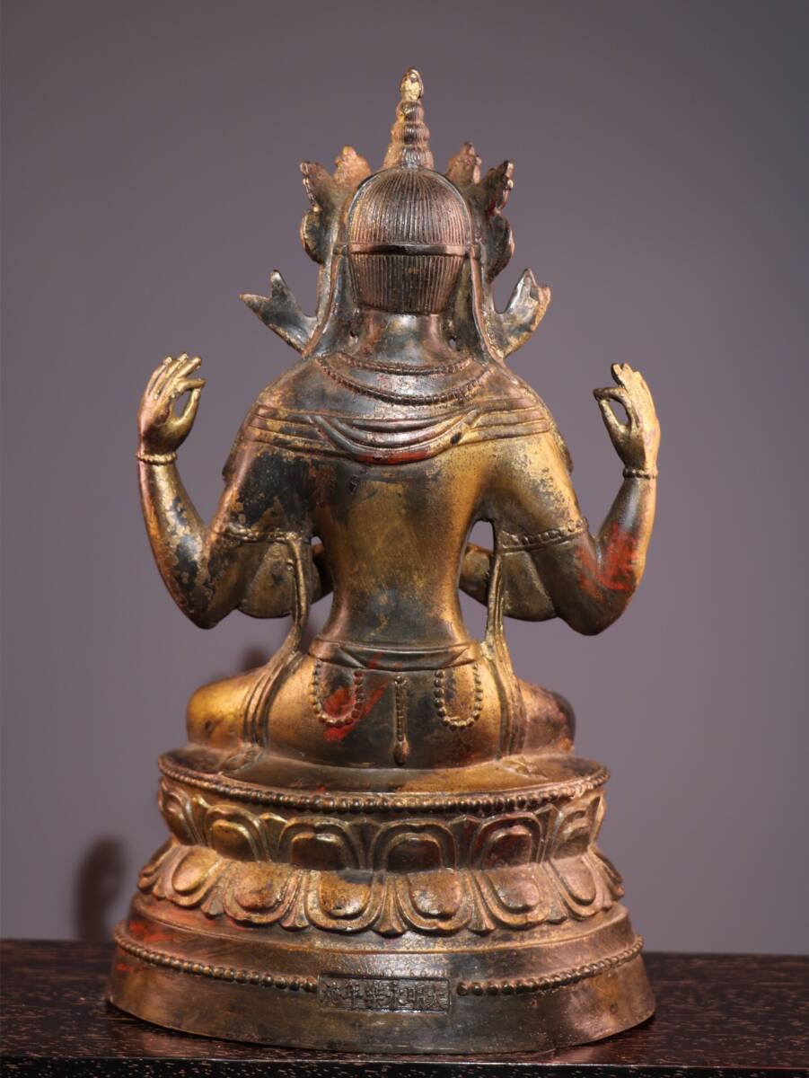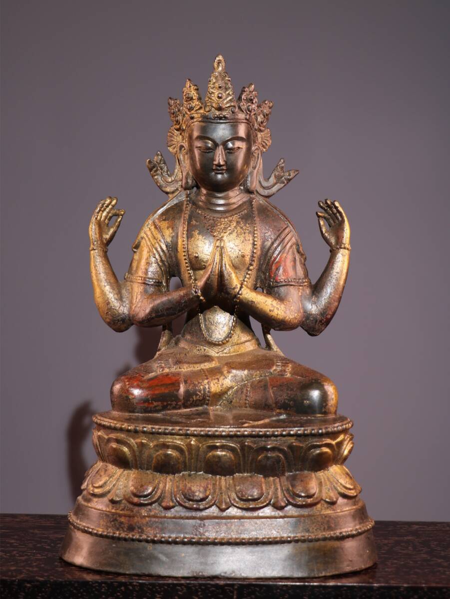 【超珍館蔵】銅製 泥金 朱砂 四臂觀音像 仏教古美術 供養品 古賞物 古美術品 稀少珍蔵品