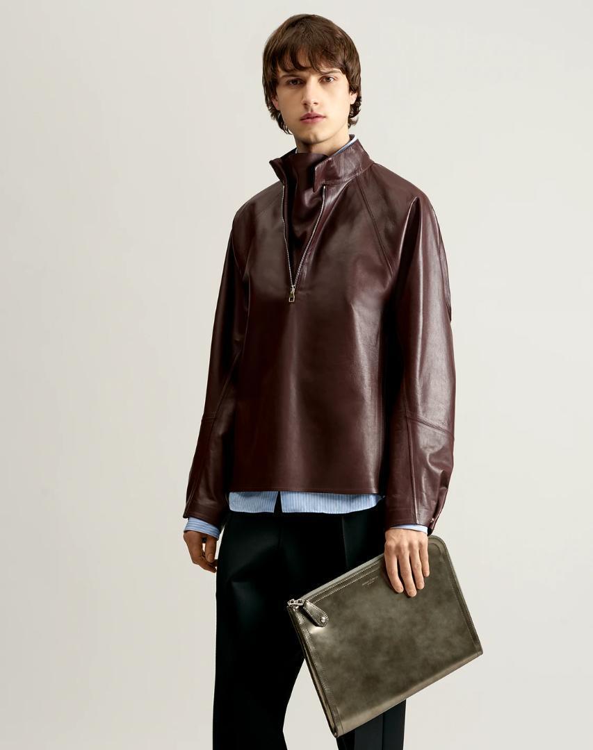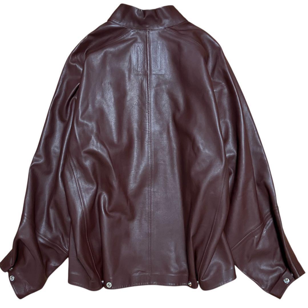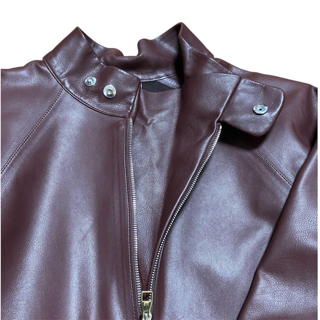 バーガンディのレザーを使用したレーシングスモック。メタル製のファスナー開閉とネックラッチが特徴のアイテムです。スナップボタンとカフス、ウエストアジャスターに「AD」のロゴがさりげなくあしらわれています。