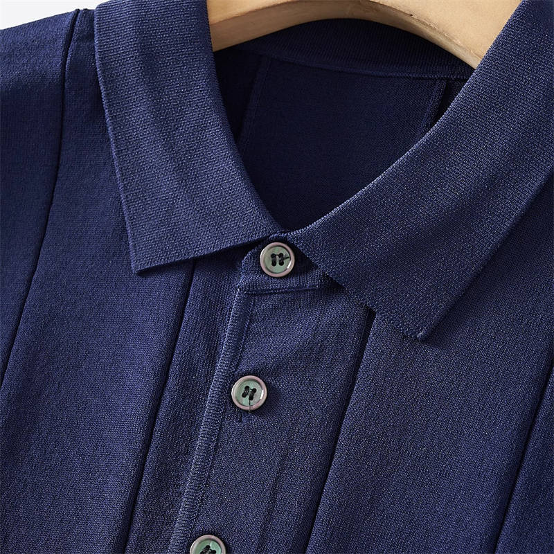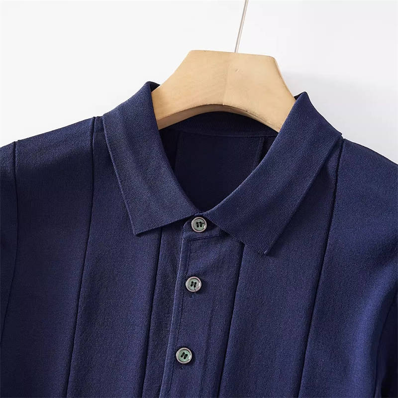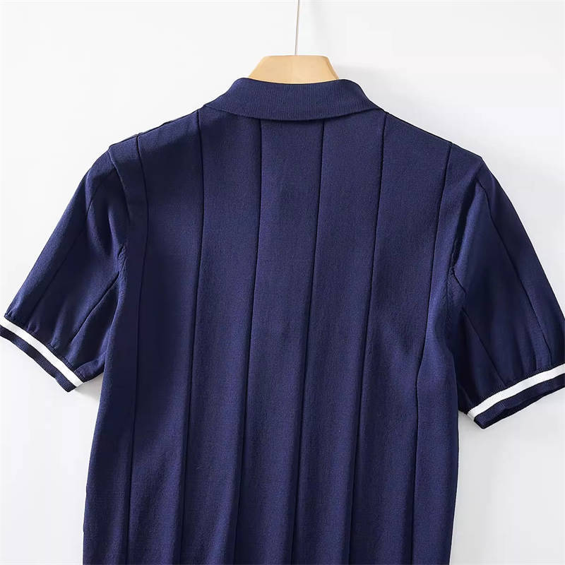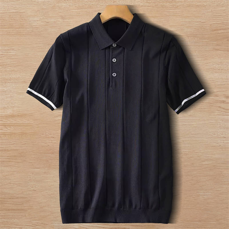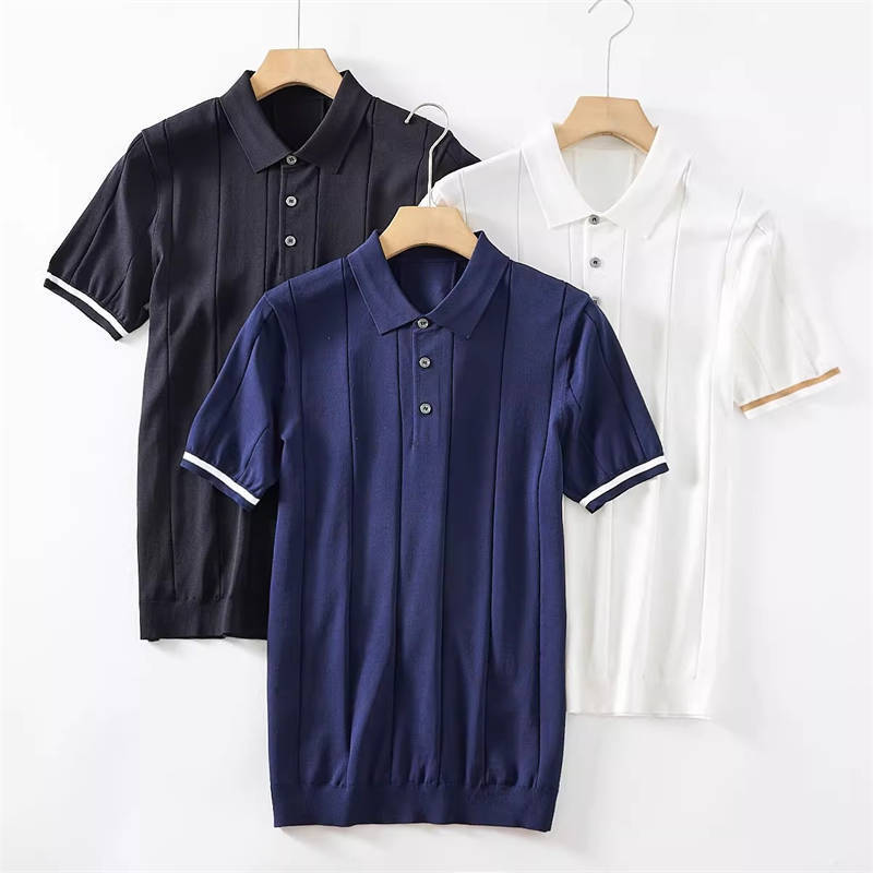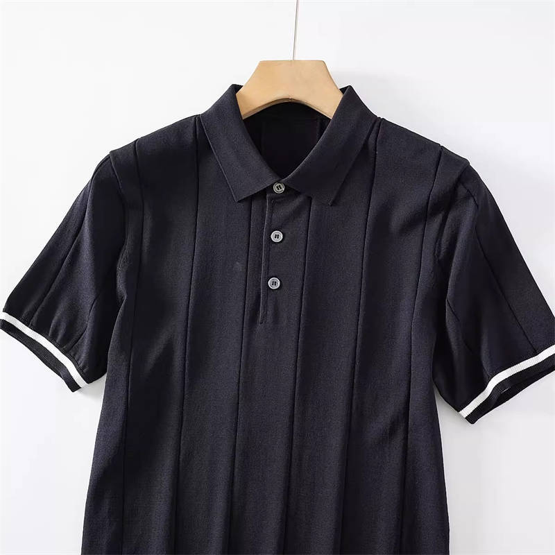 W0742-L黒色 新品 サマーニット ポロシャツ 半袖 薄手 テンセル混 ゴルフ 接触冷感 縦ストライプ しなやか 春夏 メンズ トップス