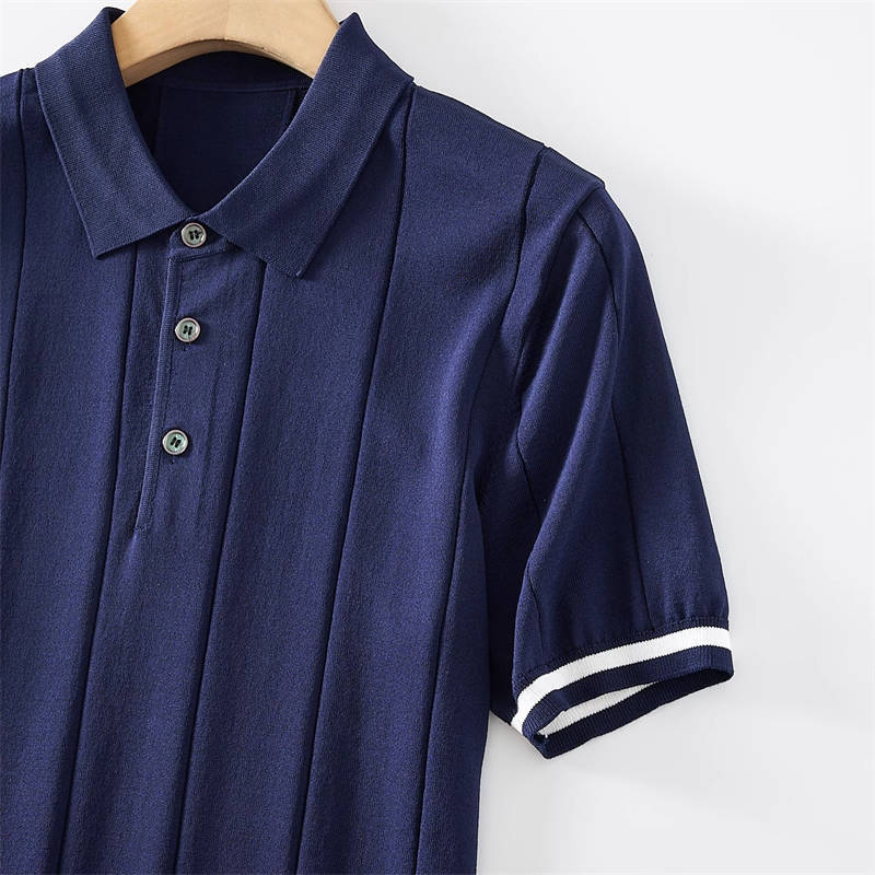 W0742-L黒色  新品 サマーニット ポロシャツ 半袖 薄手 テンセル混 ゴルフ 接触冷感 縦ストライプ しなやか 春夏 メンズ トップス