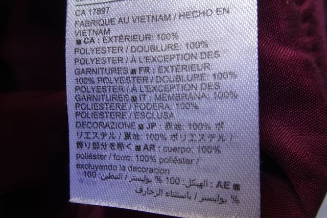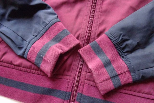 首ぐり、袖口、裾は紺ライン入り赤紫リブ素材です。