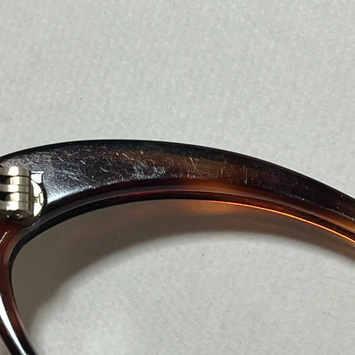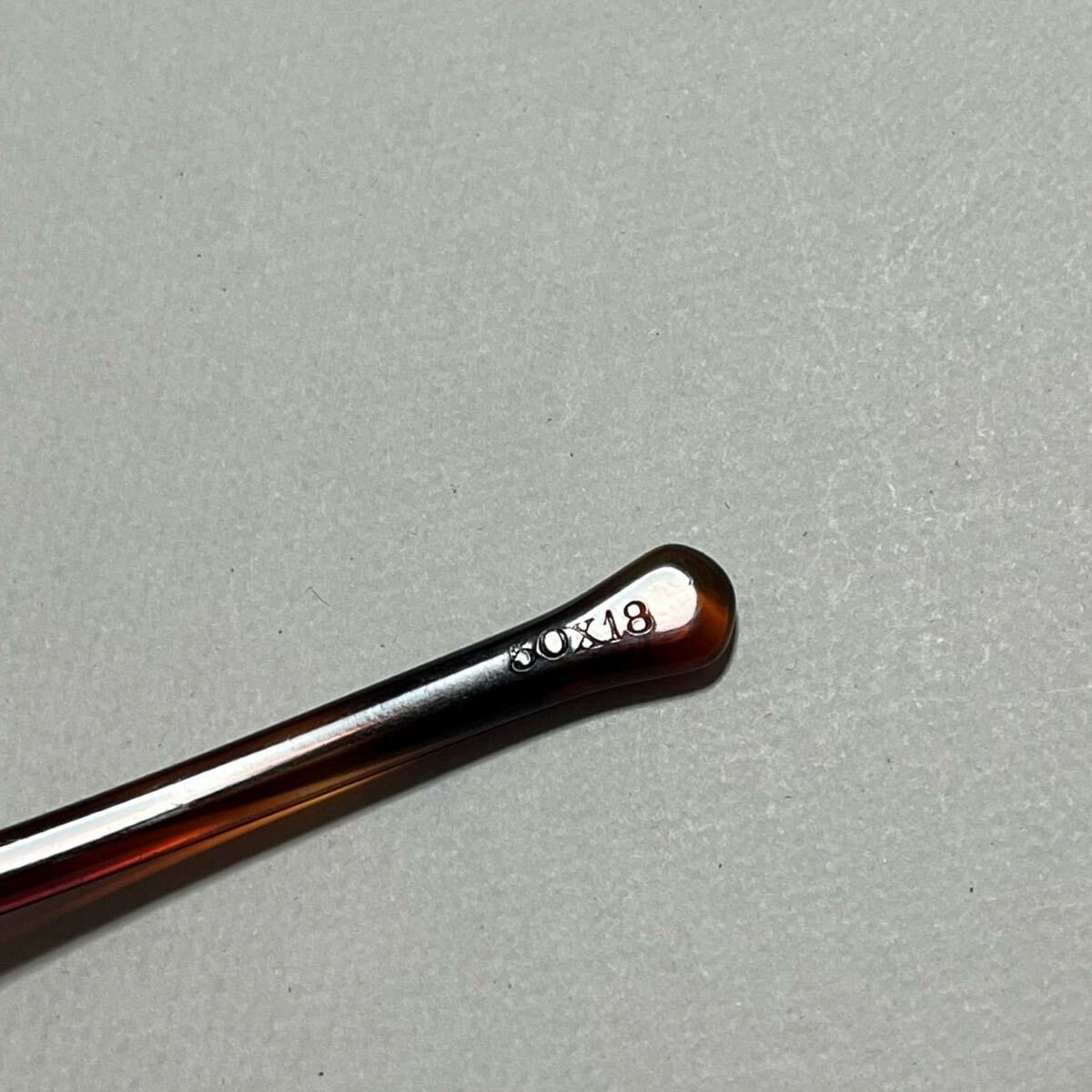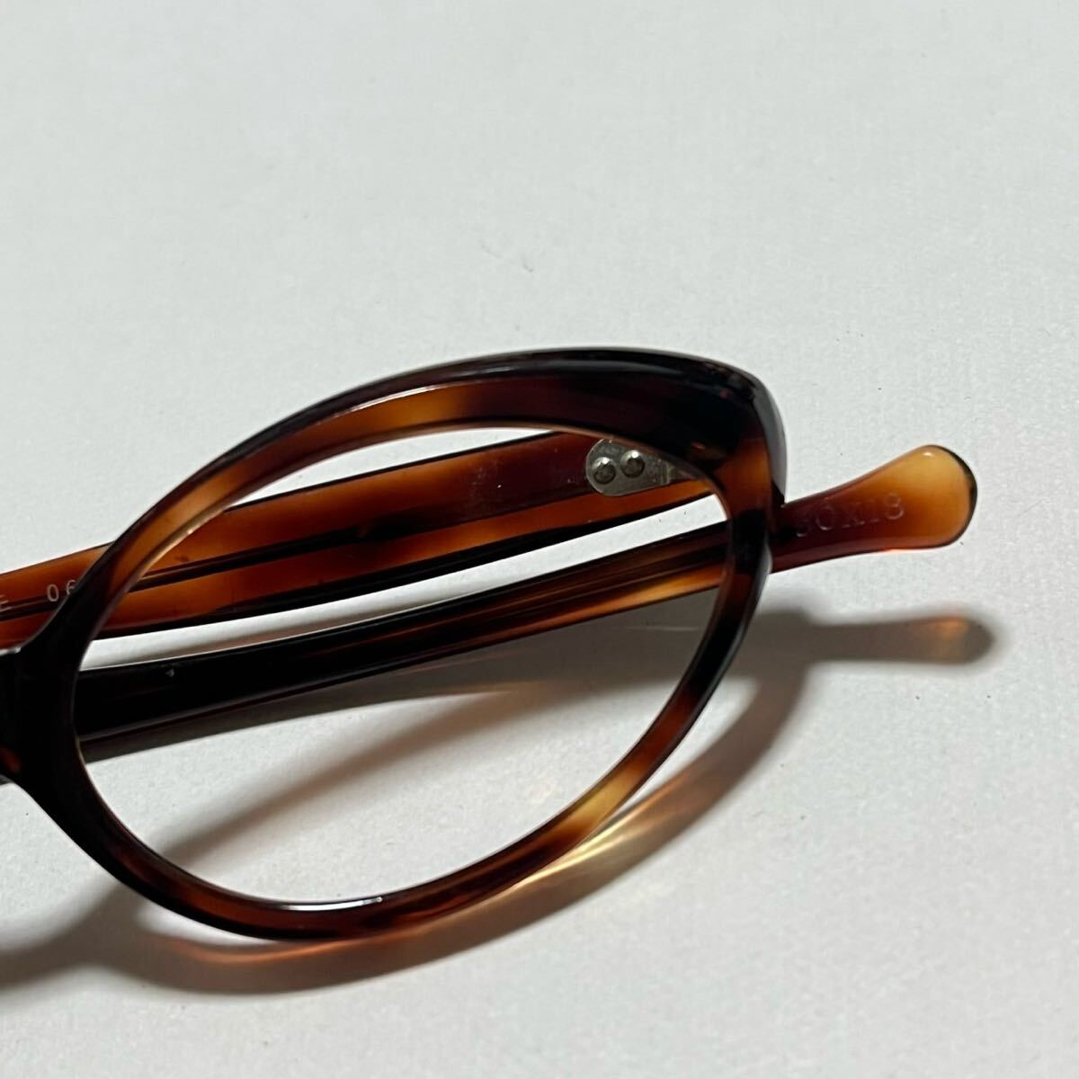 透明感の強いアンバーカラー、交錯する様に配されたストレートテンプル、テンプルに施された2ドット等、この年代らしいディティールが散見される”らしい”一本です。