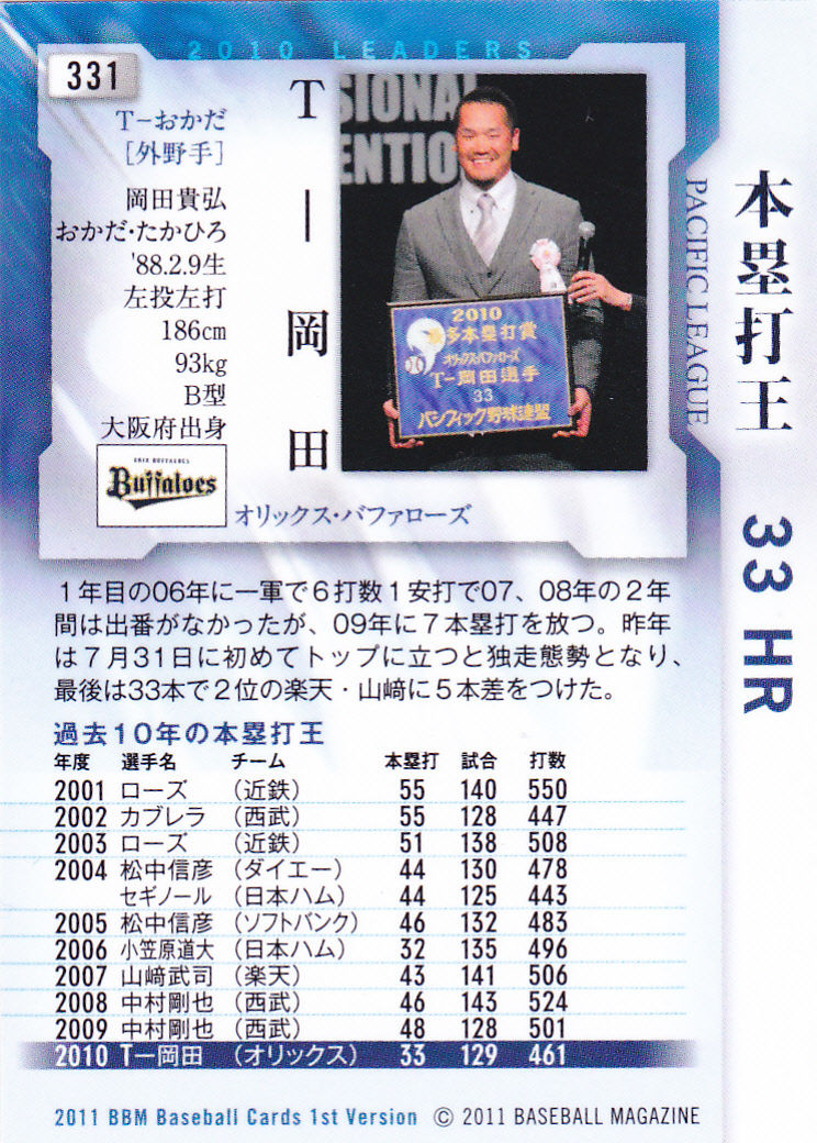 2011BBMベースボールカード1st 331 T-岡田 オリックス 大阪府 本塁打王