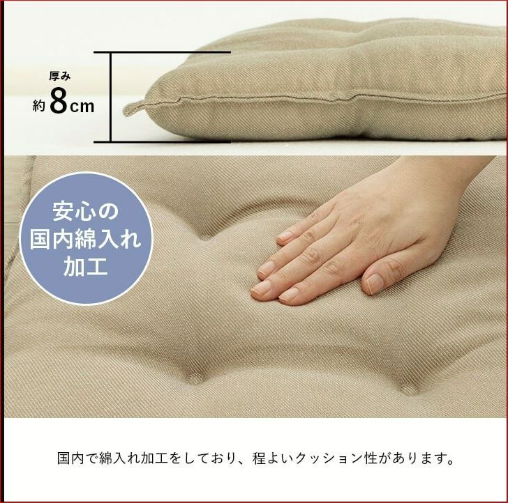 綿入りの厚み8cmの国産のシートクッションです。ダイニングチェアに最適、オフィスチェア、学習椅子などにもお使い頂けます。