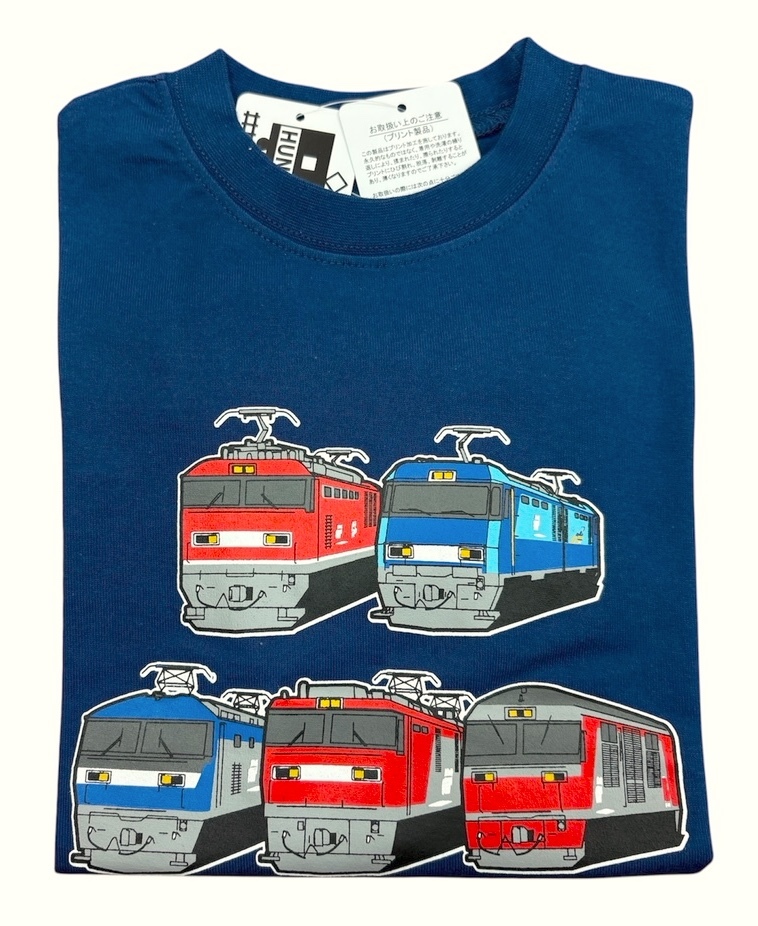 JRのレッドベアー レッドサンダー ブルーサンダーなどの車両大集合の天竺生地のTシャツです。