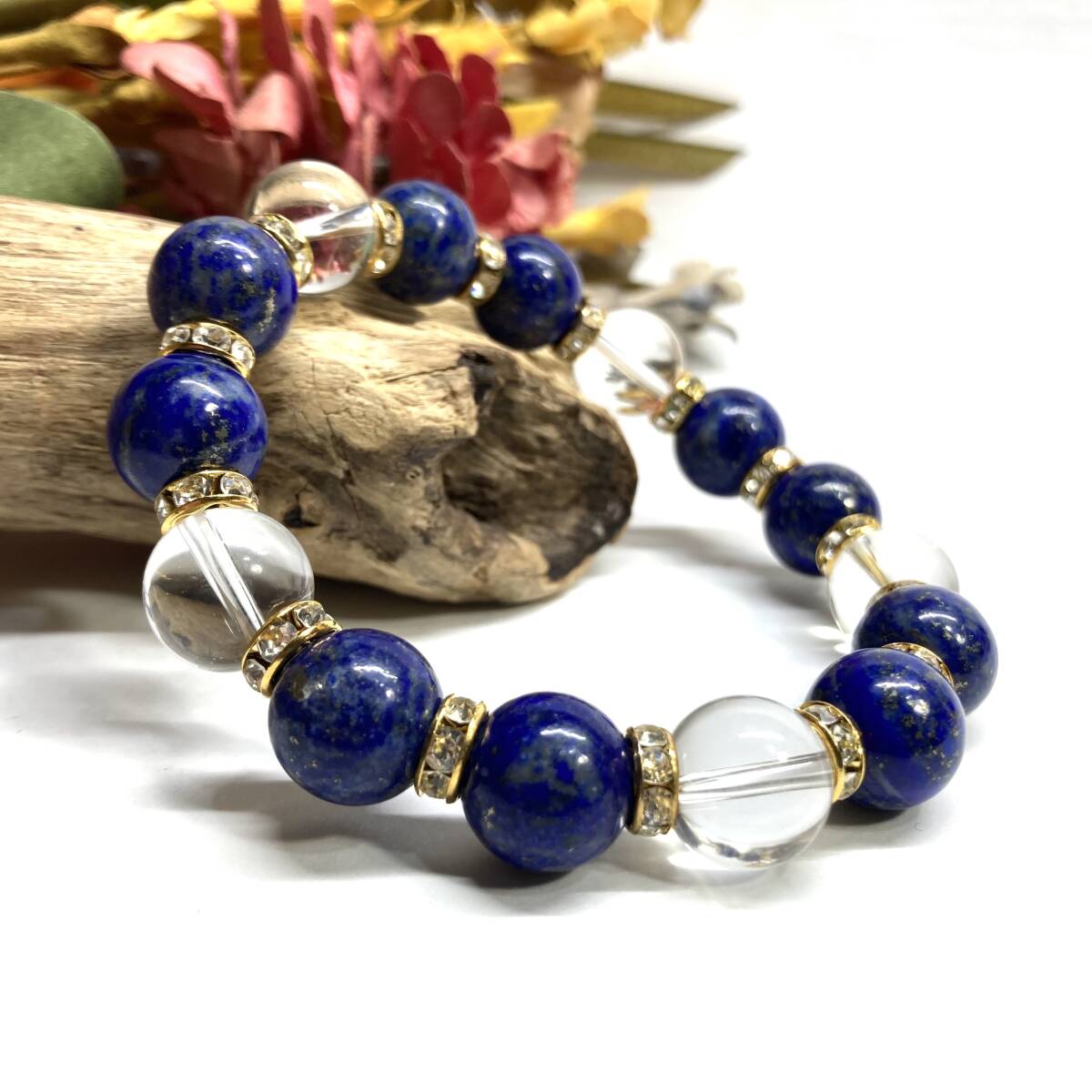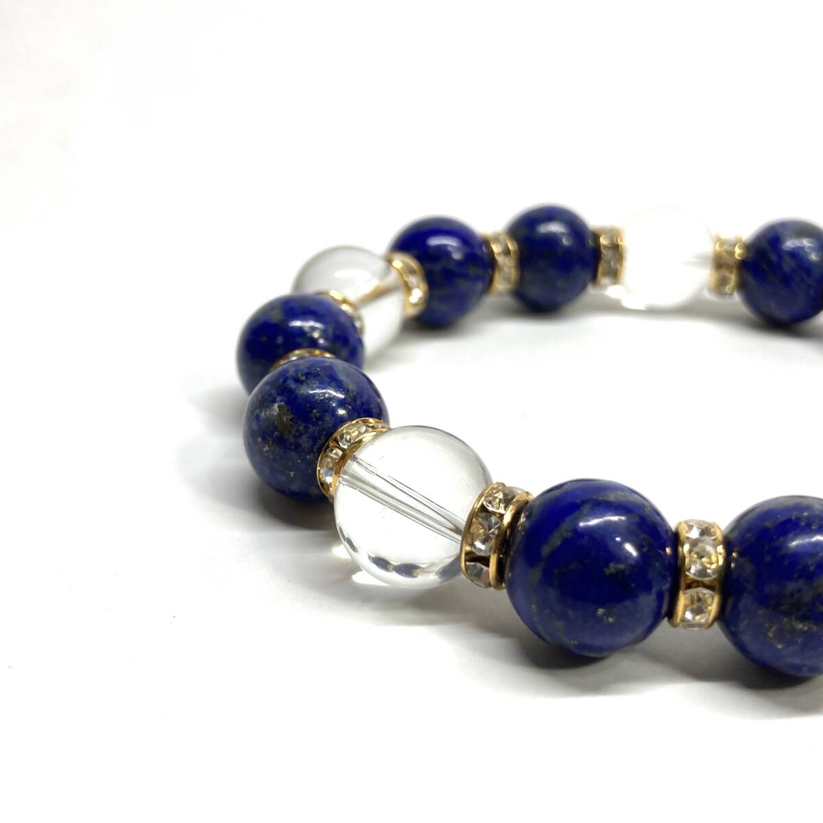 こちらは、ラピスラズリと水晶を組み合わせたパワーストーンブレスレットです。間にはロンデルを挟み高級感あるデザインに仕上げております。程よくインパクトがある12mm玉を使用して内周約18cmです。(サイズ変更の場合は取引ナビにてご連絡をお願いします。) 数に限りがございますので気になる方はお早めにどうぞ。