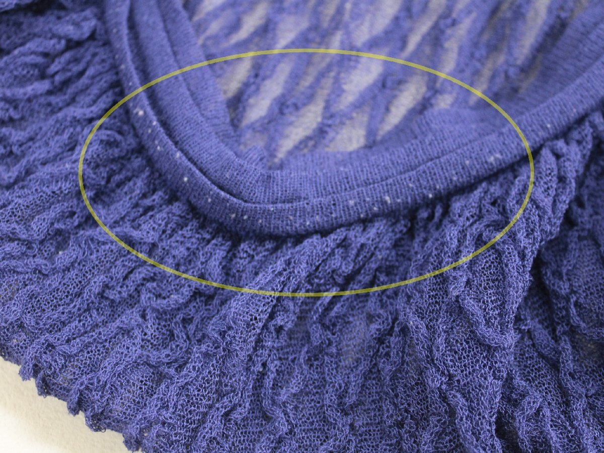 ・両脇、後ろ左裾等全体的にほつれ、糸引きあり(画像6,7枚目)