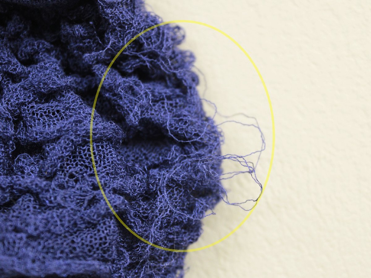 ほつれは全体的にあり、糸が垂れているものもありますが、生地感的に遠目には目立ちにくく、着用に問題ないと思われます。