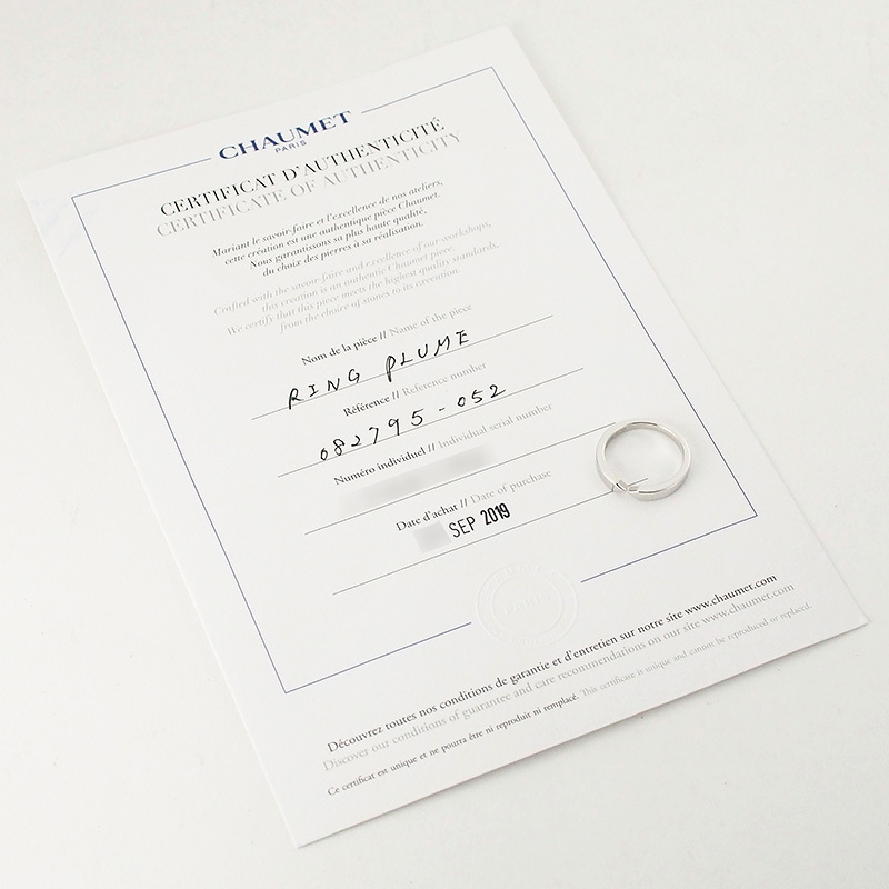 | 刻印 | Pt950 CHAUMET シリアルナンバー 52 |