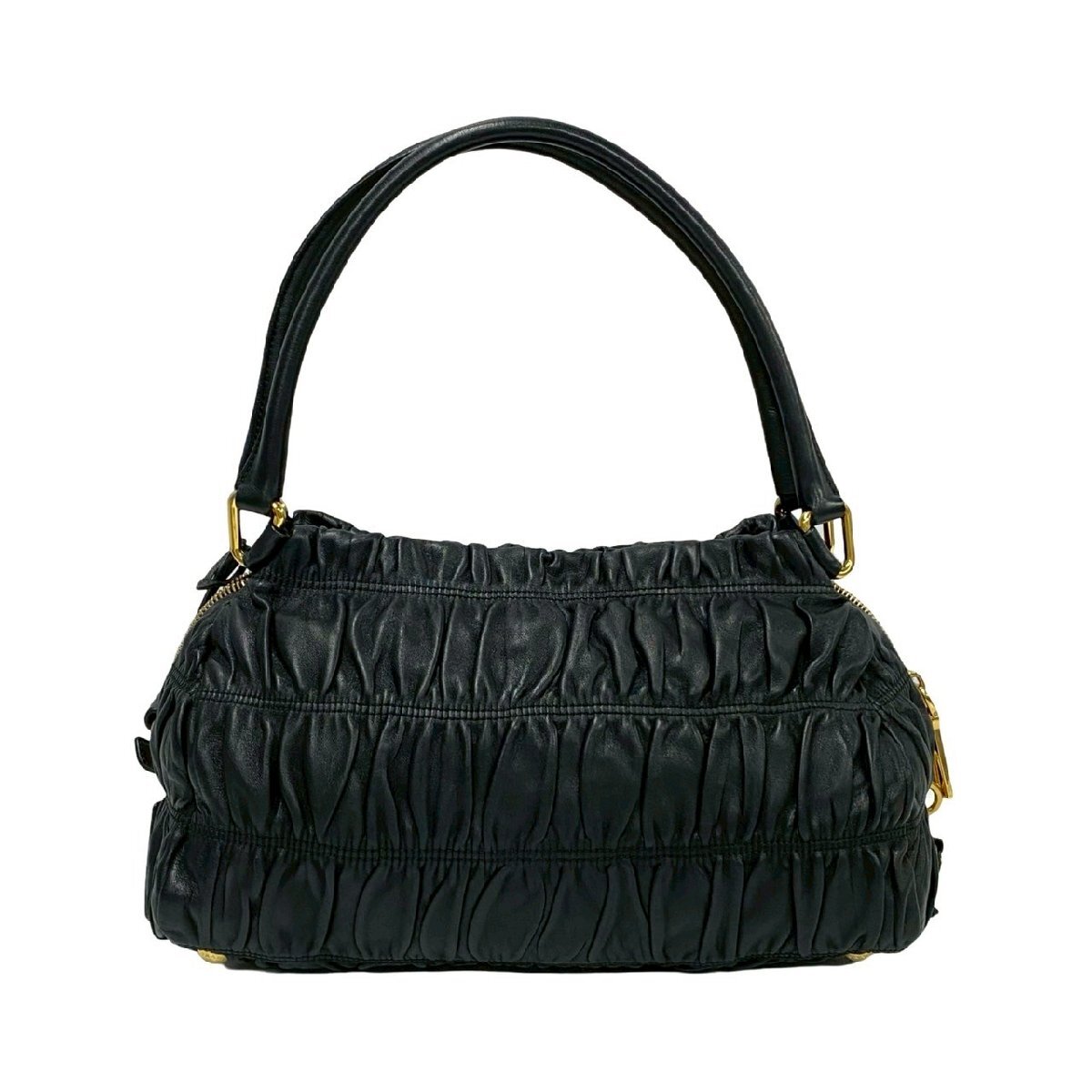 極 美品 袋 鍵付き PRADA プラダ ロゴ 金具 リボン モチーフ レザー 本革 ギャザー ハンドバッグ セミ ショルダーバック ブラック 55763