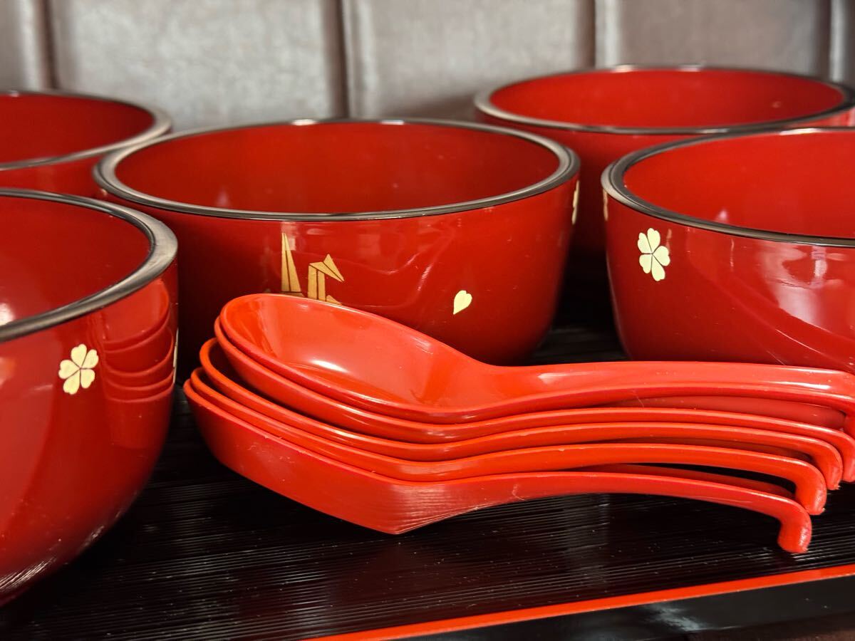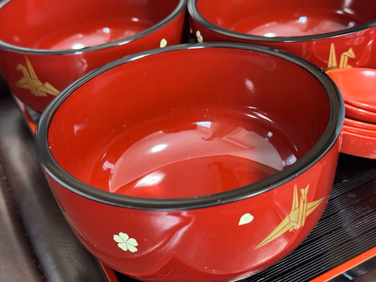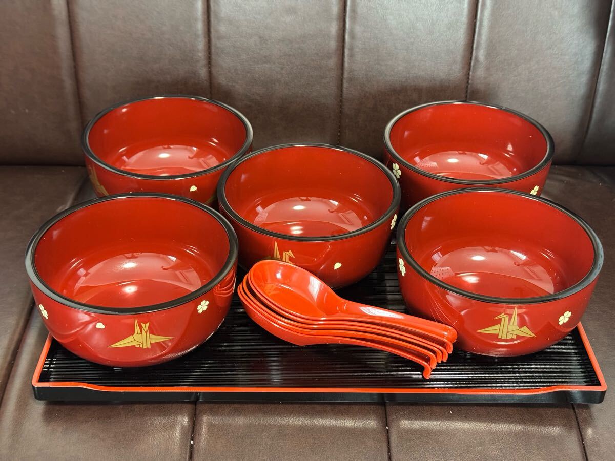 お好み椀 お盆 レンゲ 5客 セット 未使用 アンティーク 折り鶴 桜 来客 食器 丼物 お椀 汁物 取り皿 | ||